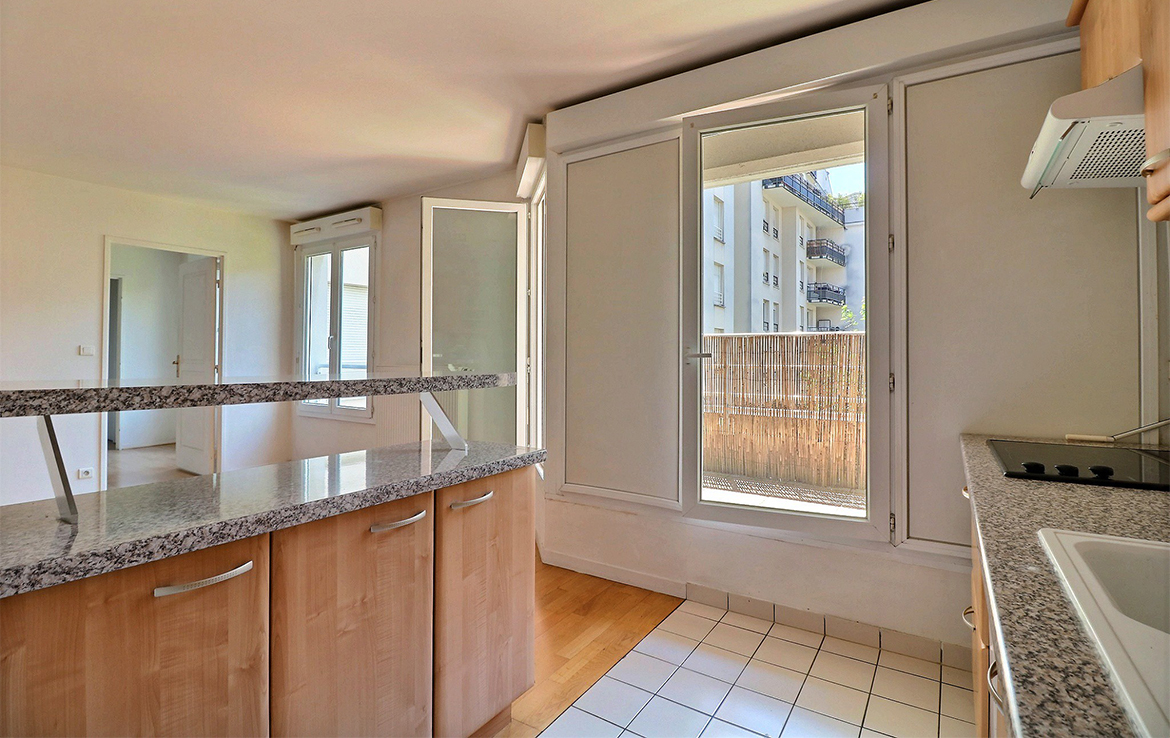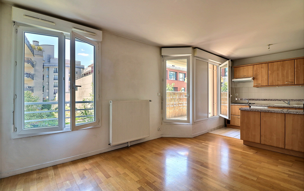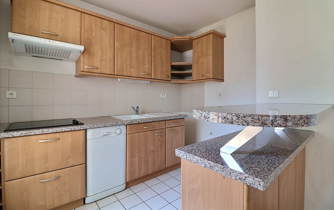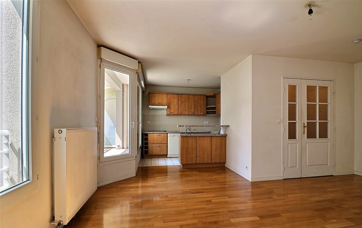 Un deux pièces composé d'une entrée avec placards, un séjour avec une cuisine ouverte entièrement aménagée.