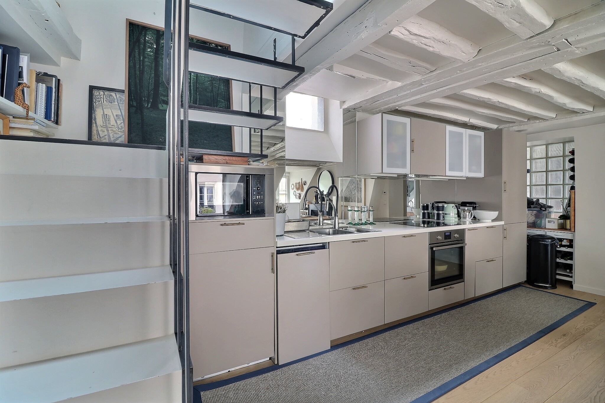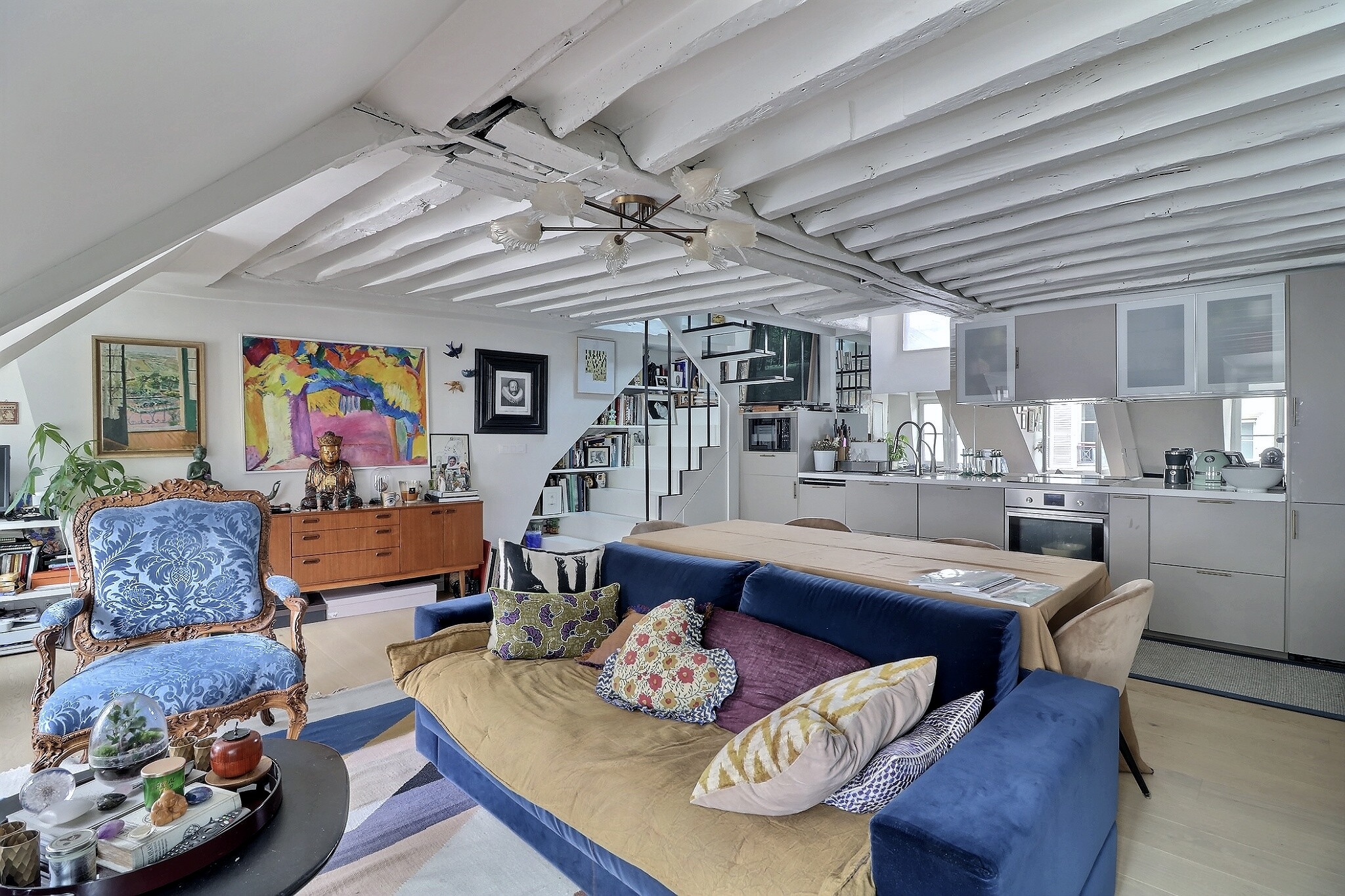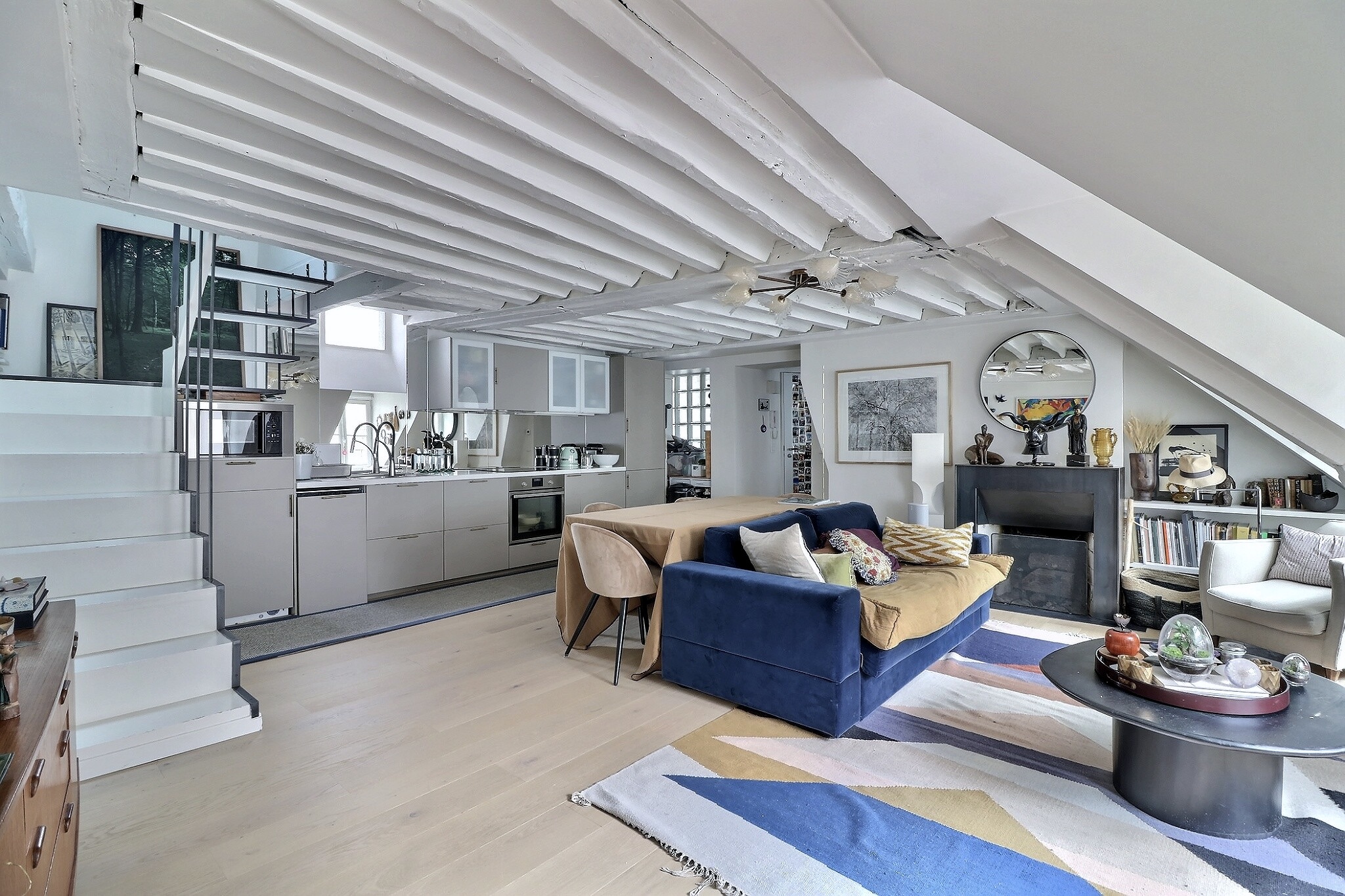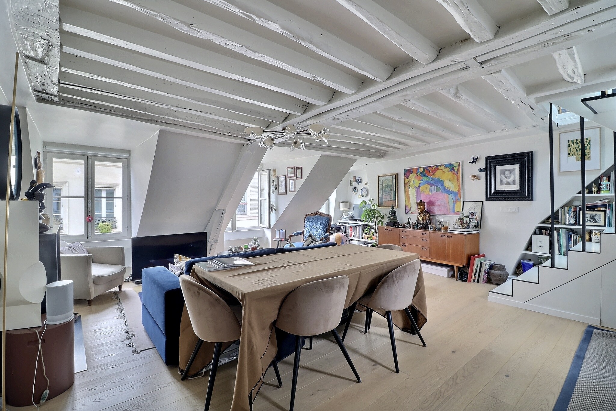 Situé au 4ème et 5ème étages (derniers étages) sans ascenseur d'un très bel immeuble du XVIIe bien entretenu, un charmant duplex comprenant au premier niveau : une entrée avec rangements sur-mesure, un séjour/salle à manger traversant dont l’exposition principale est Ouest, une cuisine ouverte aménagée et équipée et une salle de bain avec un toilette. Au second niveau: une charmante chambre mansardée avec placards sur-mesure.