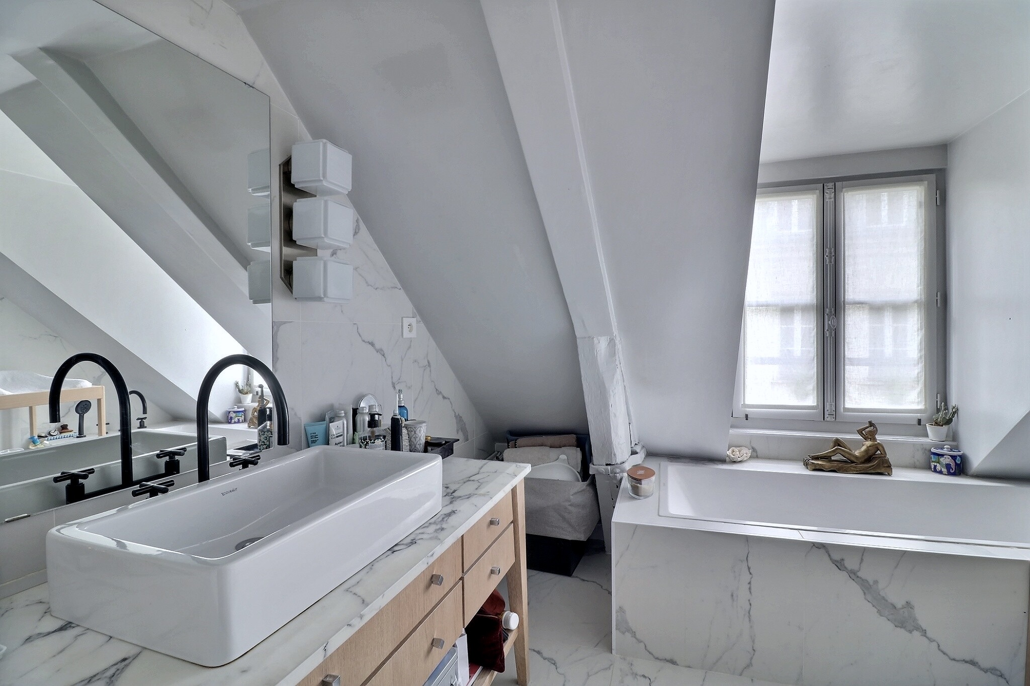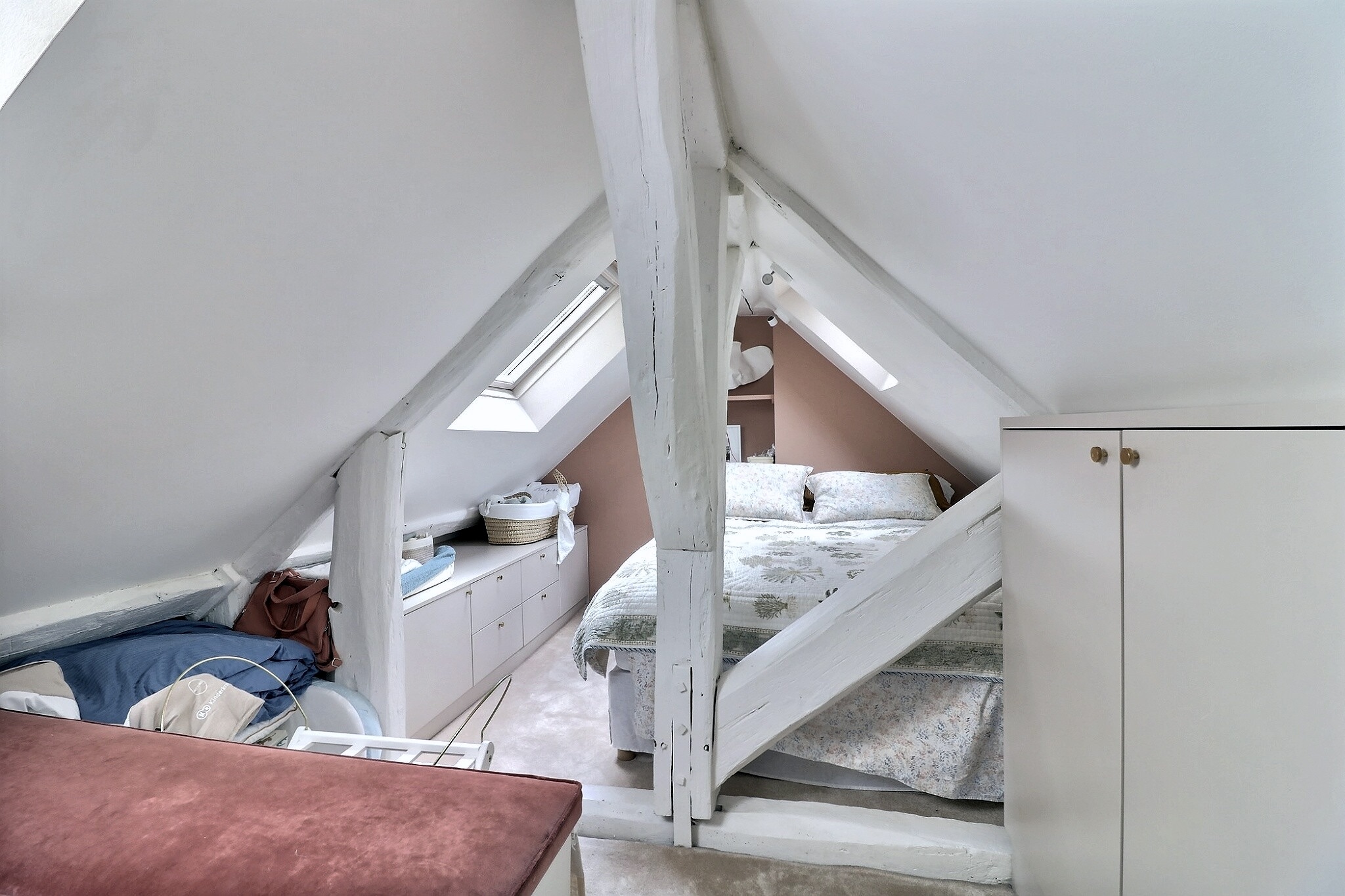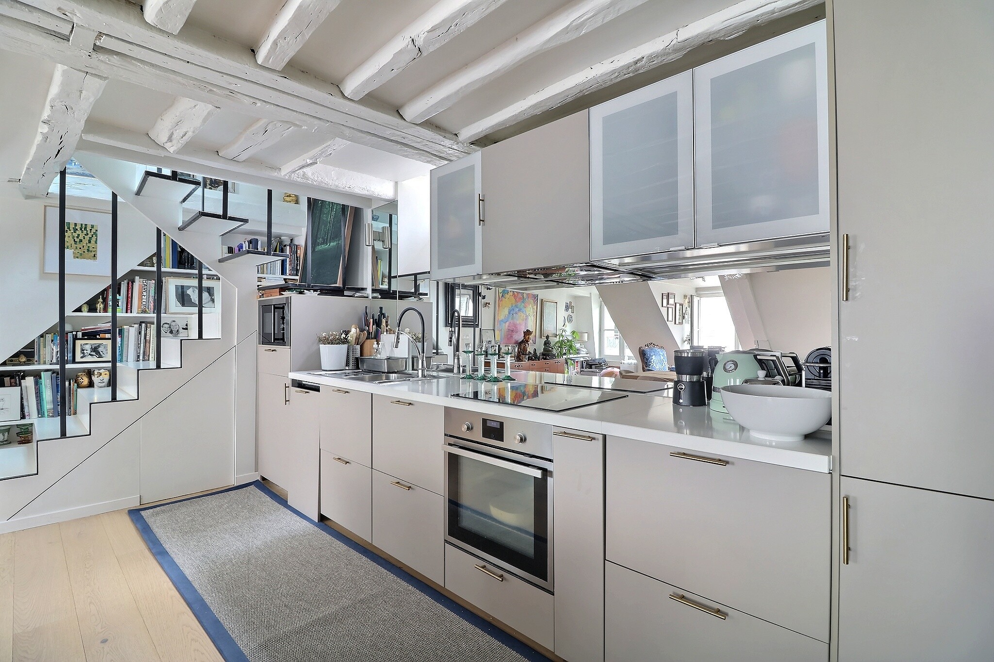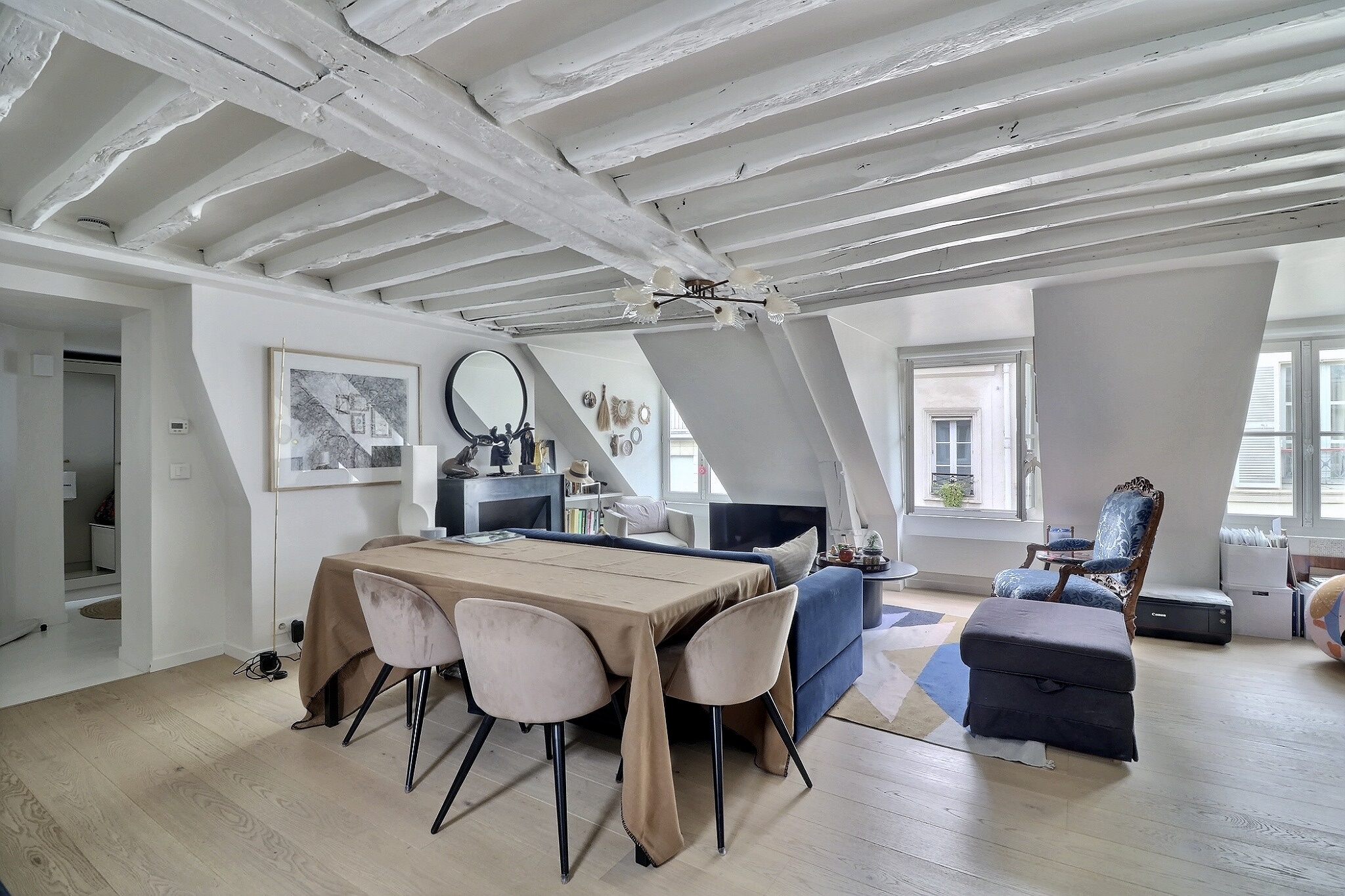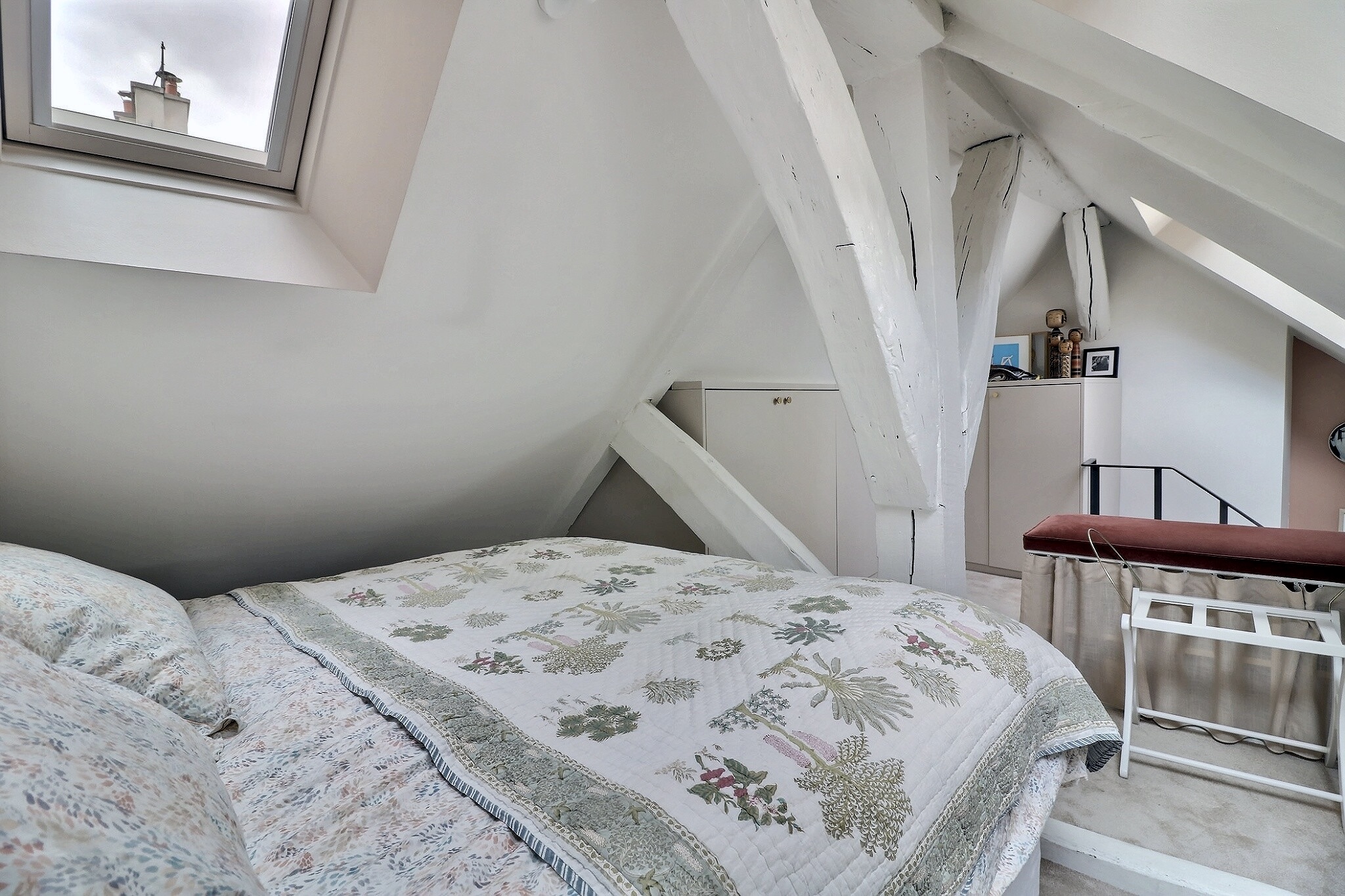 Situé au 4ème et 5ème étages (derniers étages) sans ascenseur d'un très bel immeuble du XVIIe bien entretenu, un charmant duplex comprenant au premier niveau : une entrée avec rangements sur-mesure, un séjour/salle à manger traversant dont l’exposition principale est Ouest, une cuisine ouverte aménagée et équipée et une salle de bain avec un toilette. Au second niveau: une charmante chambre mansardée avec placards sur-mesure.