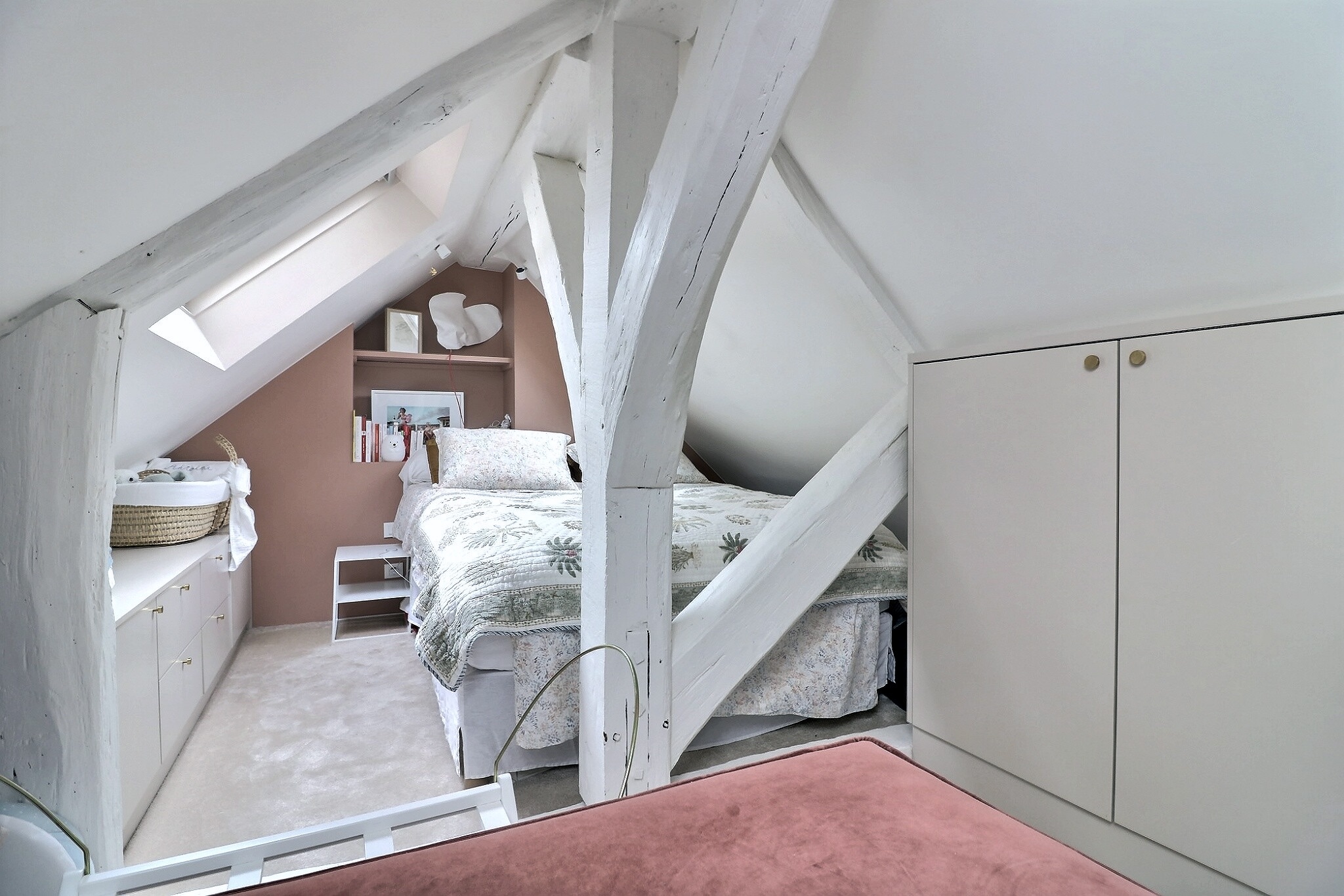 Ce bien rare a su conjuguer esprit contemporain et charme de l’ancien avec ses poutres apparentes et sa cheminée.