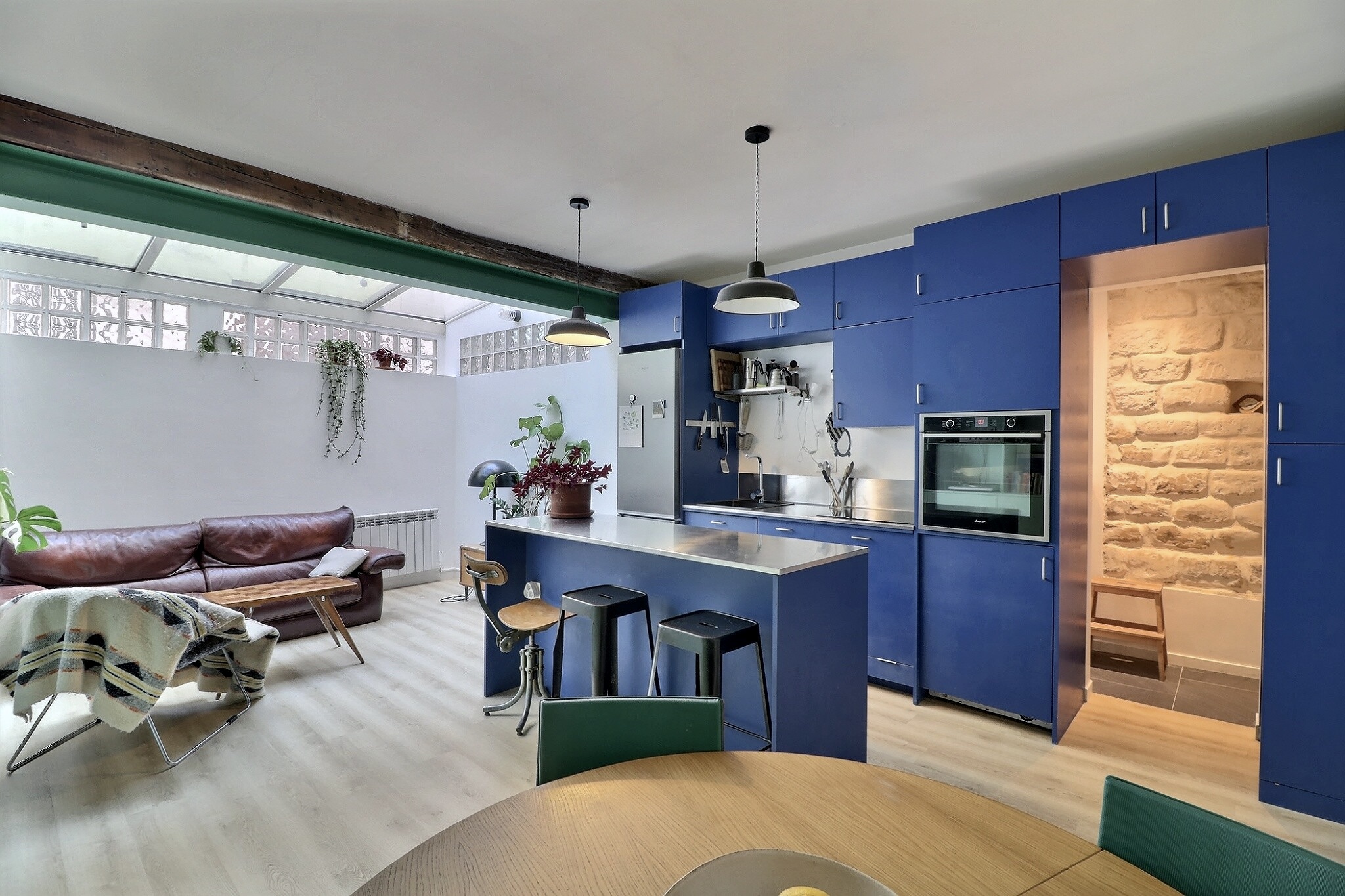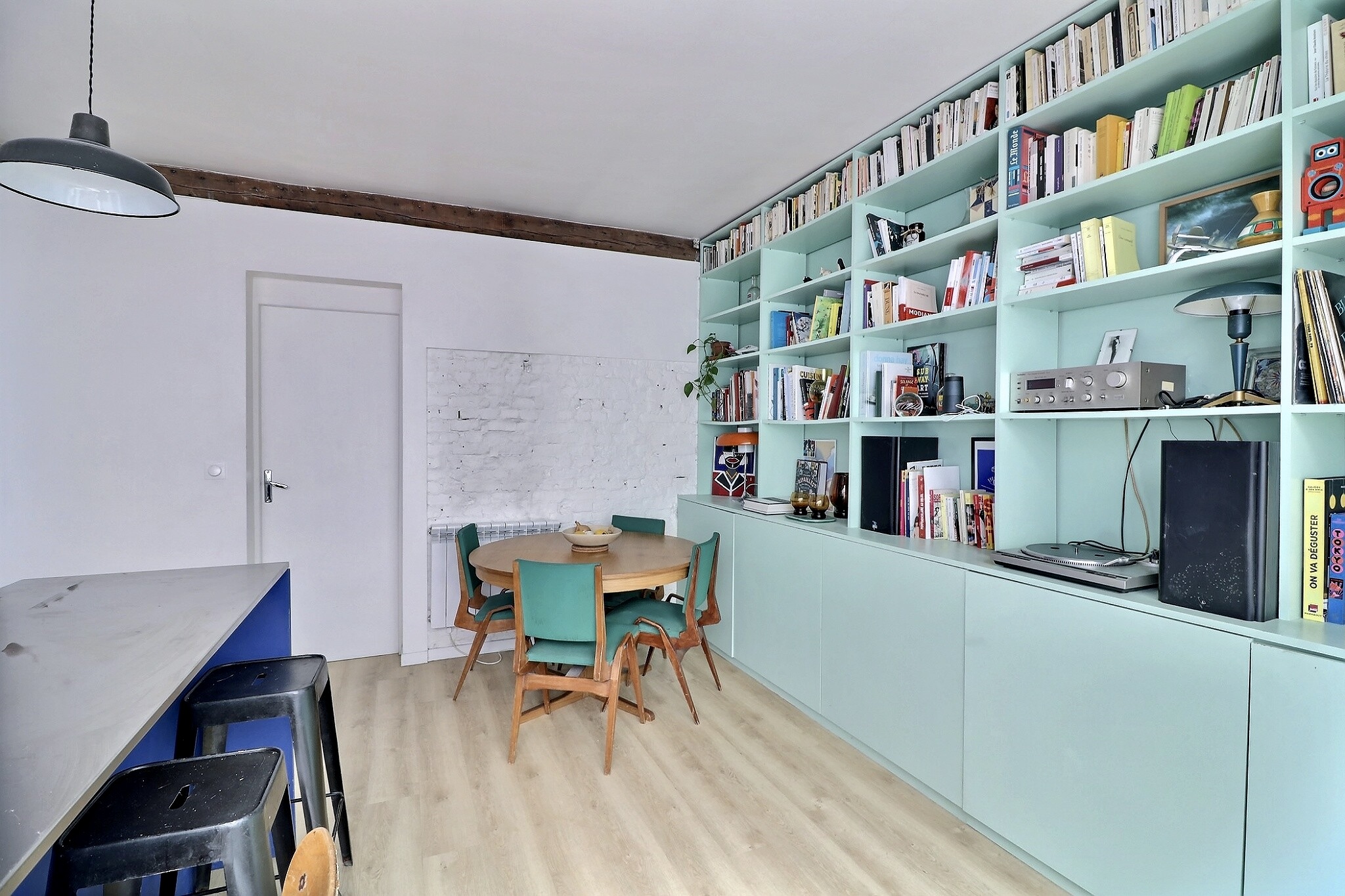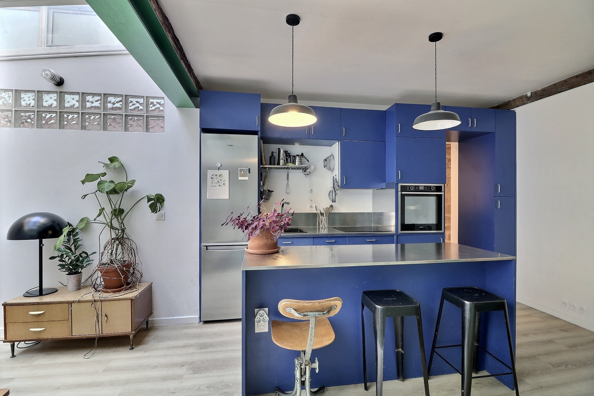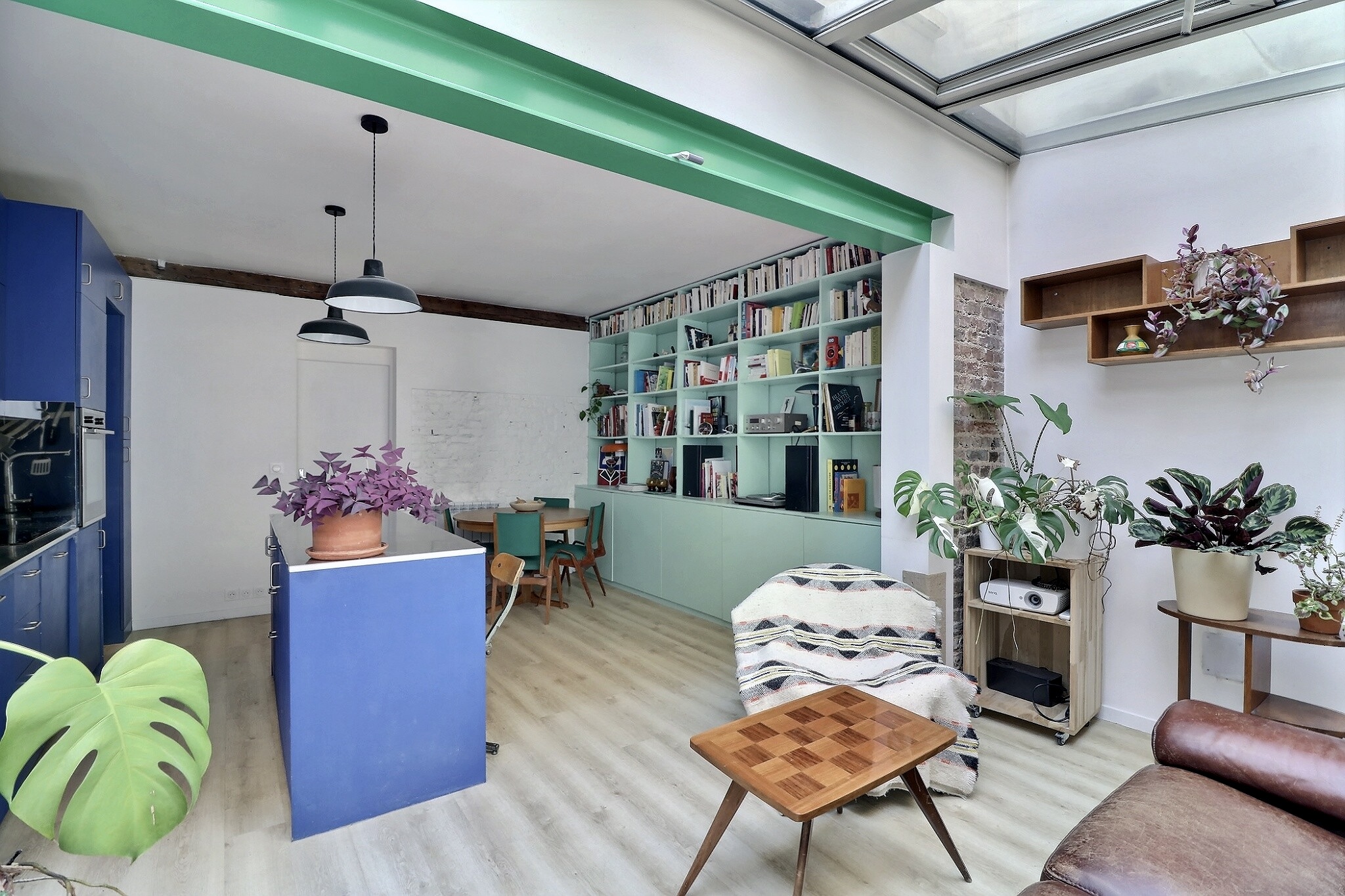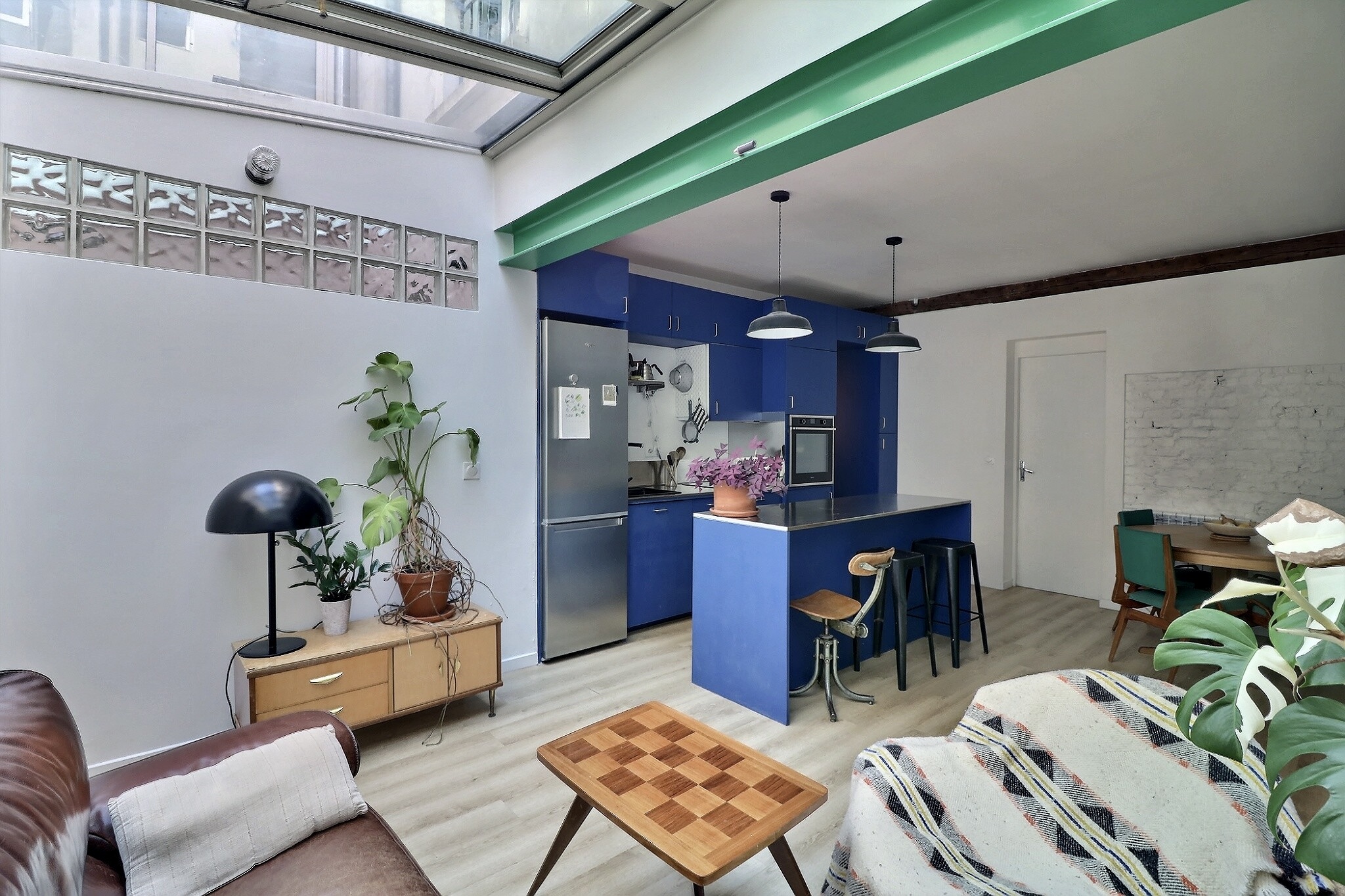 Entièrement refait par architecte et offrant de belles prestations, il se compose d'une entrée, d'un séjour sous une verrière zénithale, d'un bel espace avec une cuisine ouverte aménagée et équipée haut de gamme, d'une bibliothèque sur-mesure, d'une chambre avec placards sur-mesure au calme sur cours, d'une salle d'eau avec douche à l'italienne et toileLe suspendu.