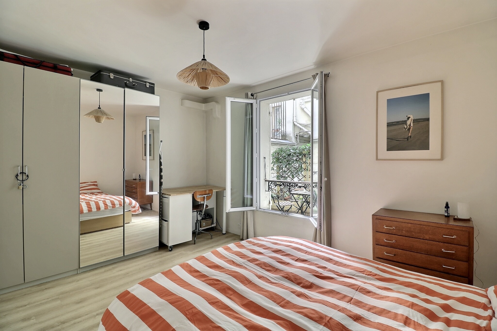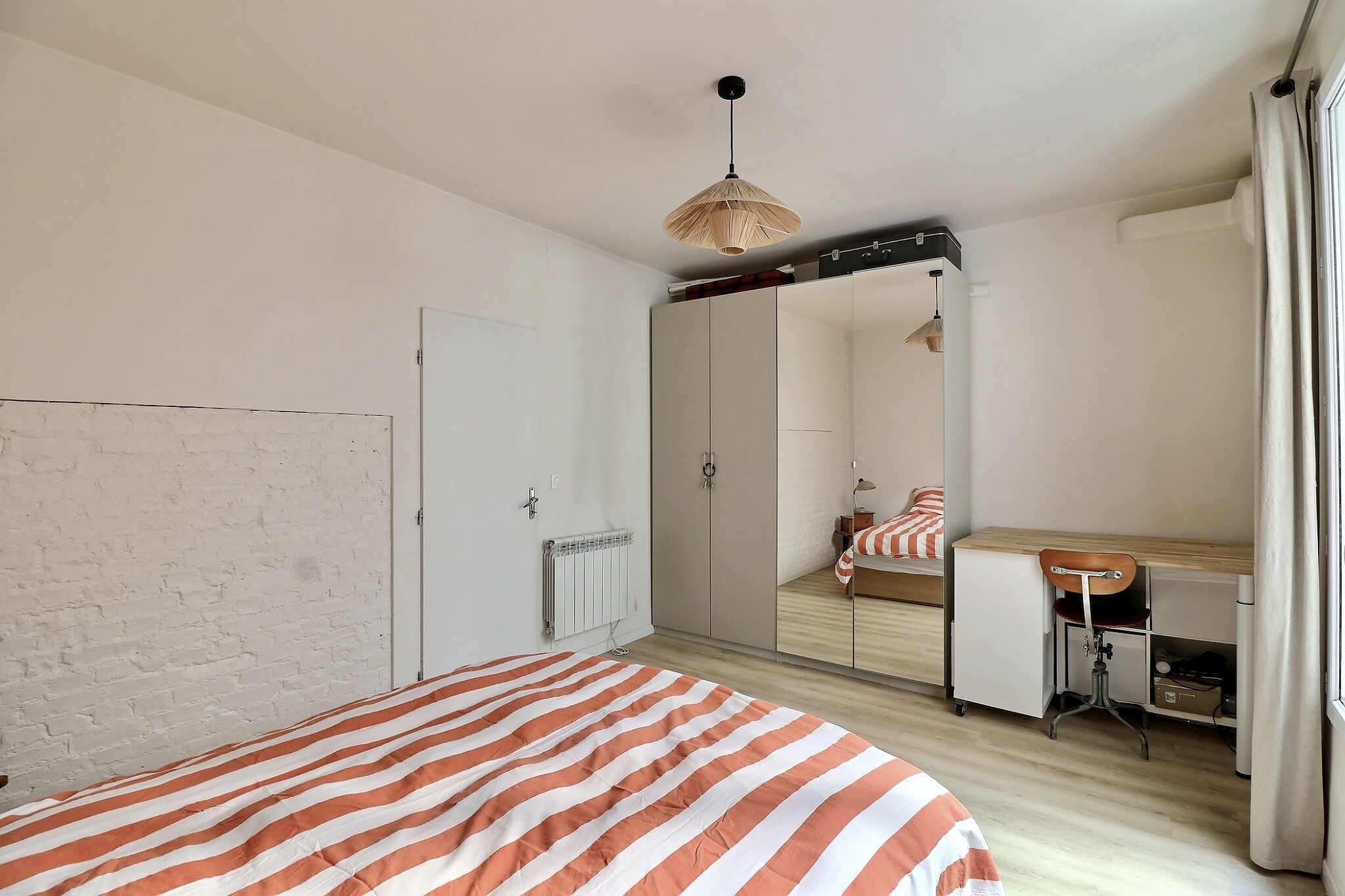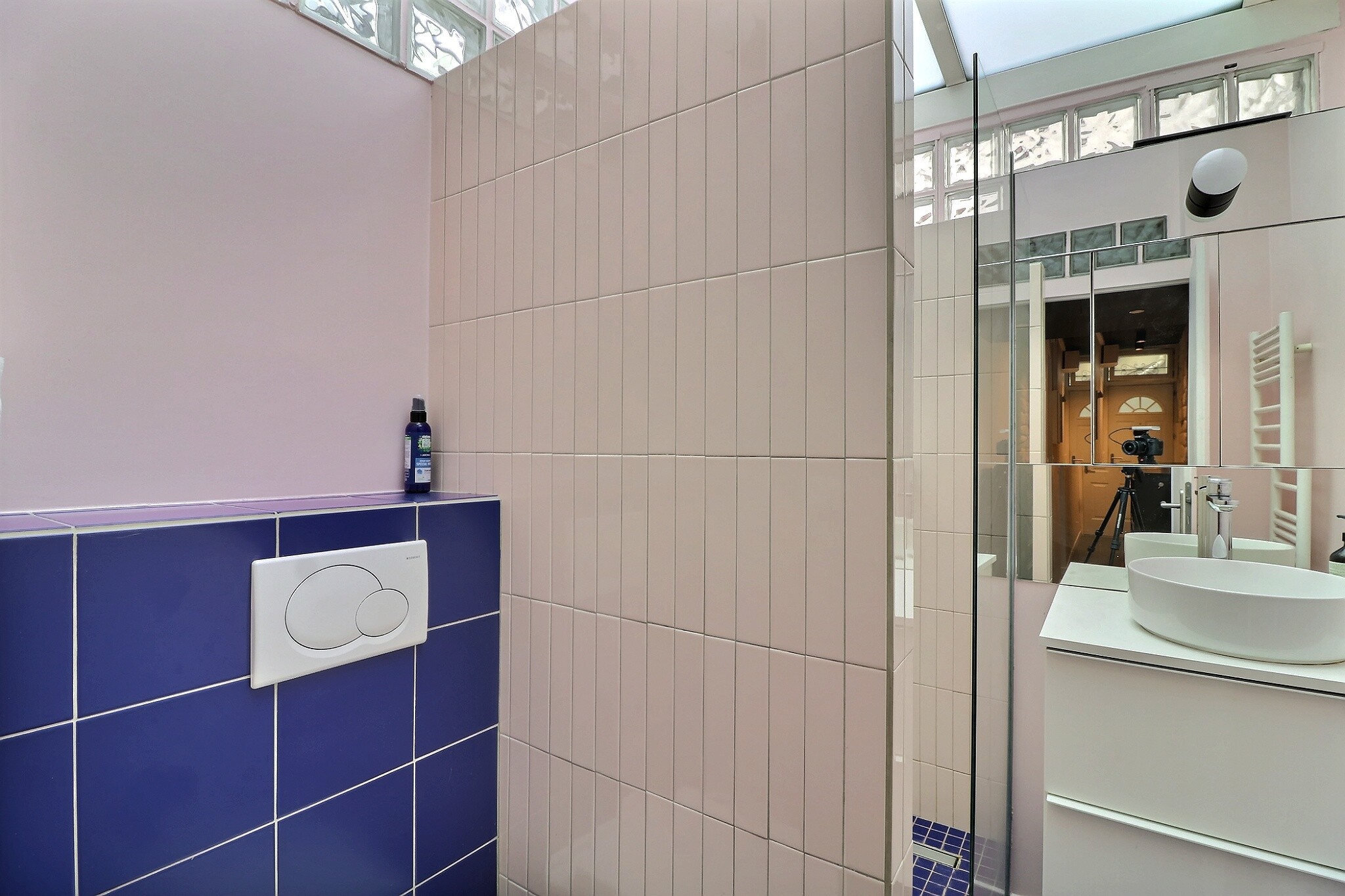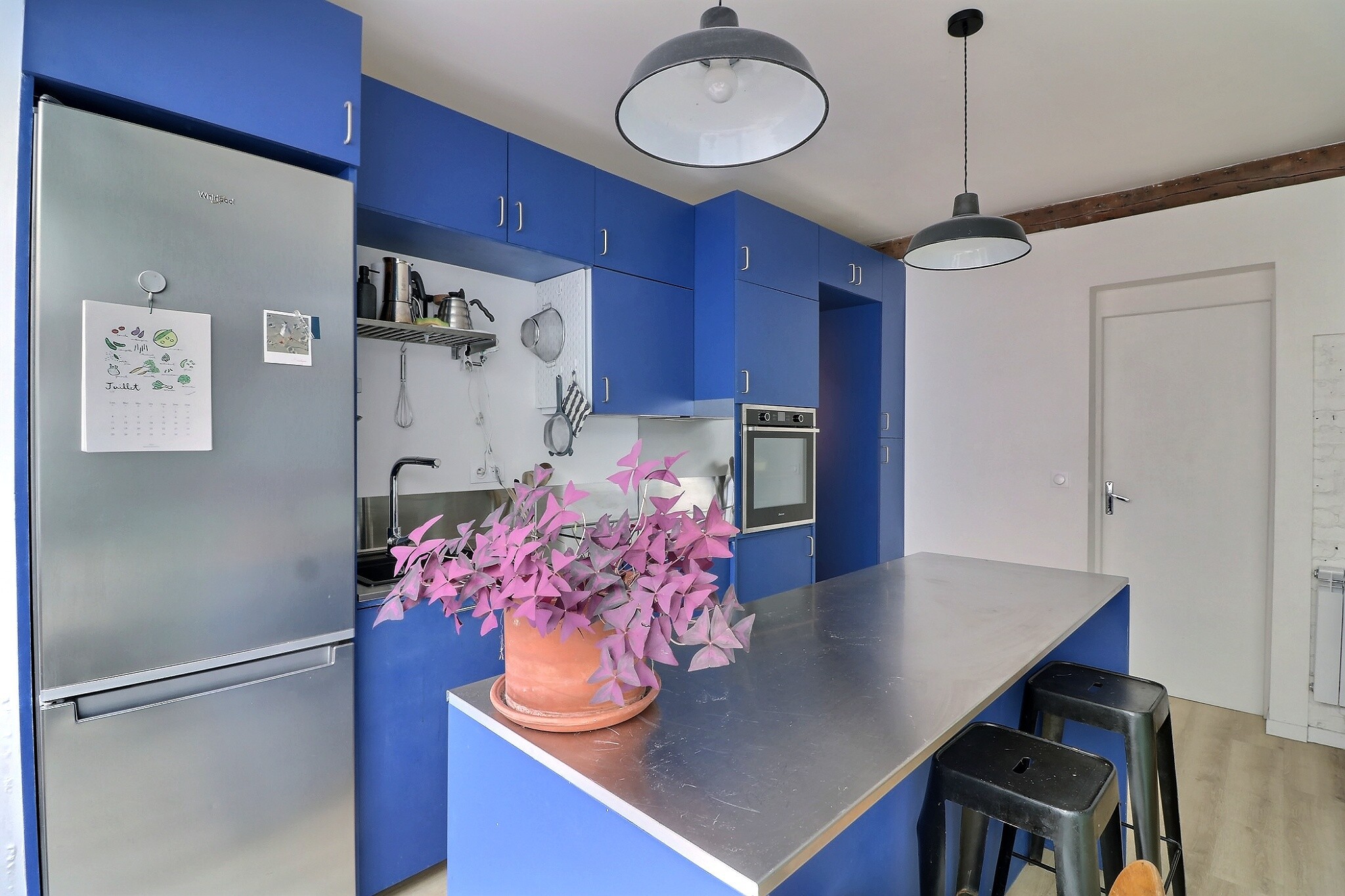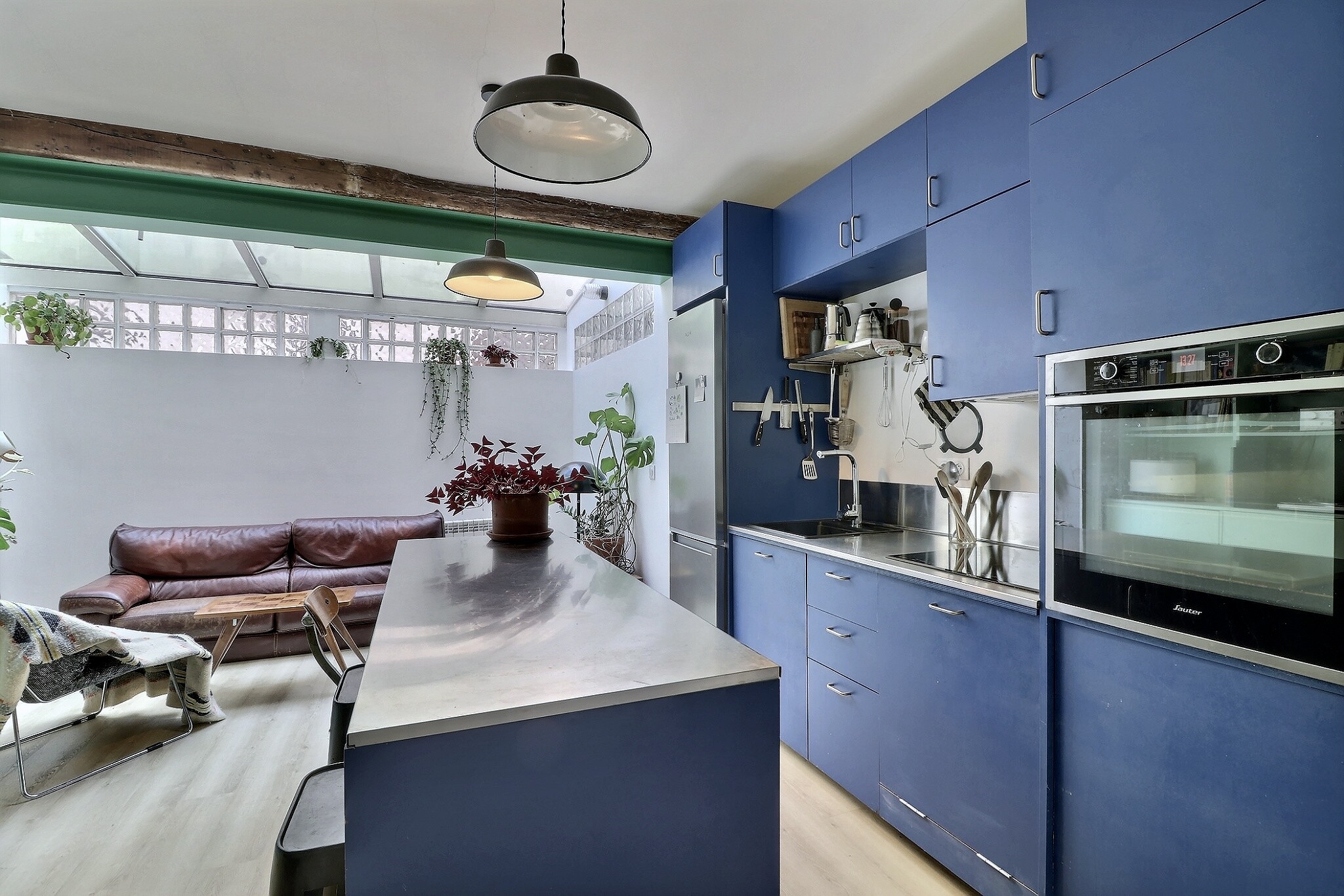 Entièrement refait par architecte et offrant de belles prestations, il se compose d'une entrée, d'un séjour sous une verrière zénithale, d'un bel espace avec une cuisine ouverte aménagée et équipée haut de gamme, d'une bibliothèque sur-mesure, d'une chambre avec placards sur-mesure au calme sur cours, d'une salle d'eau avec douche à l'italienne et toileLe suspendu.