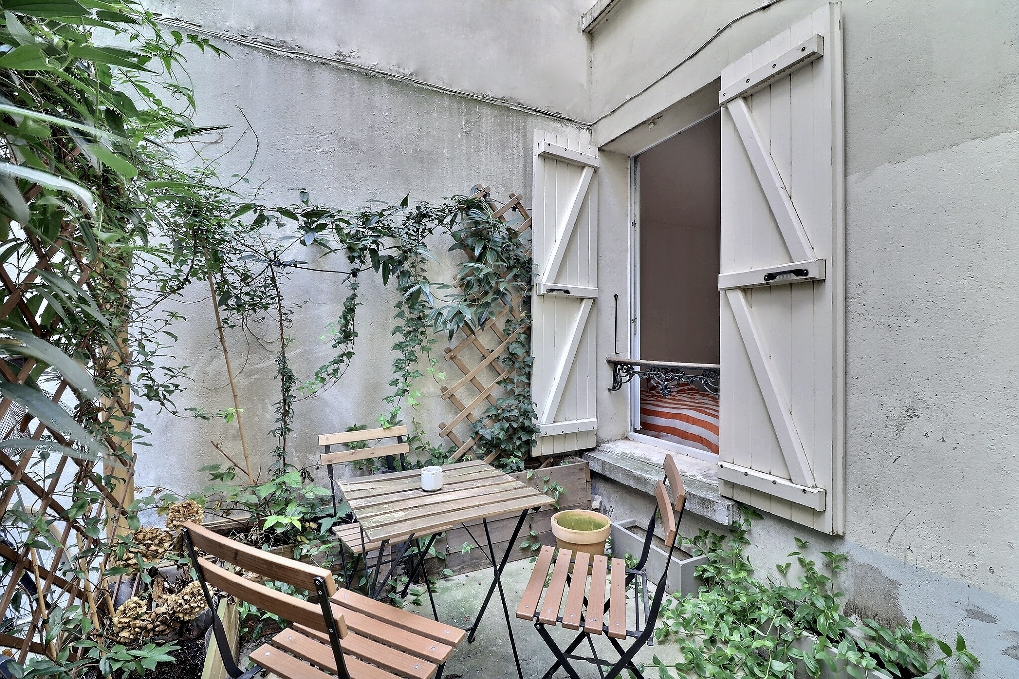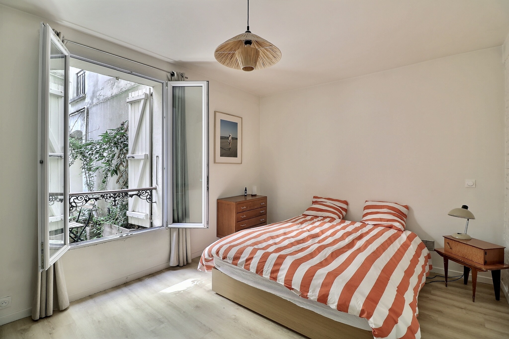 itué au RDC d'un immeuble en pierre de Paris bien entretenu, un charmant 2 pièces au style loft profitant de beaux volumes et d'un plan sans perte de place.