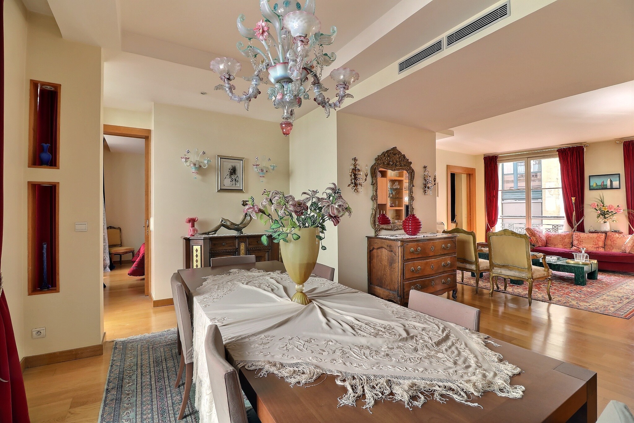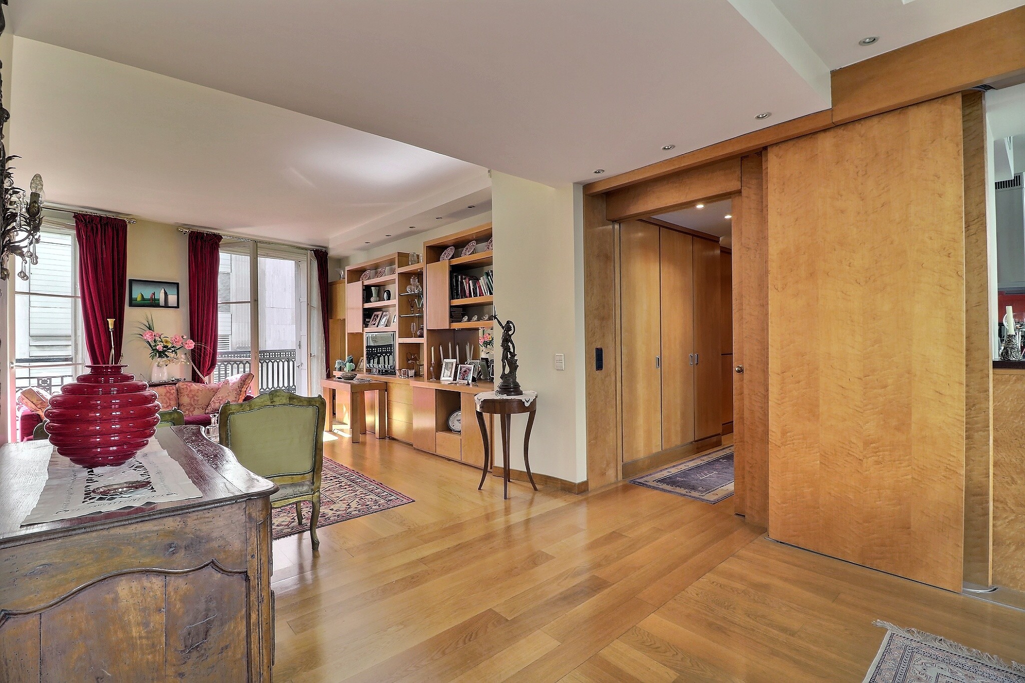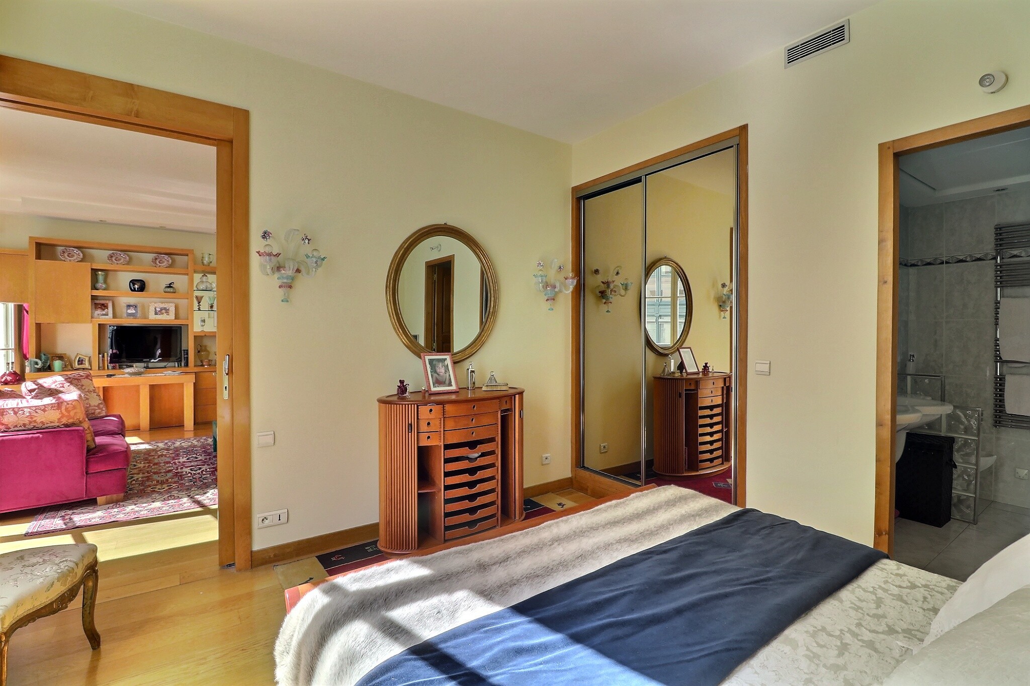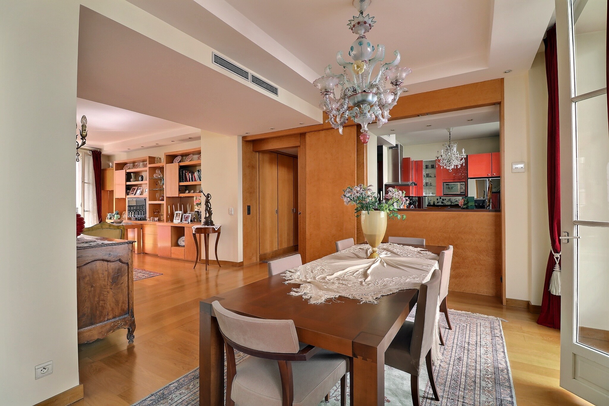 L’appartement profite de nombreux aménagements de confort, tel qu’une climatisation réversible et un système hifi encastré, une bibliothèque et des rangements sur mesure.