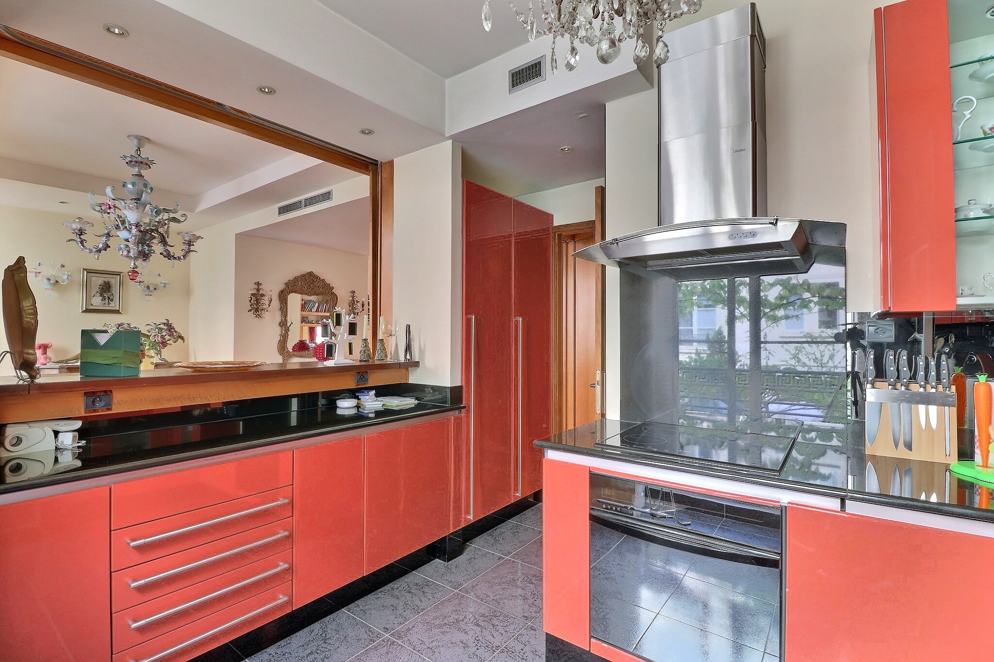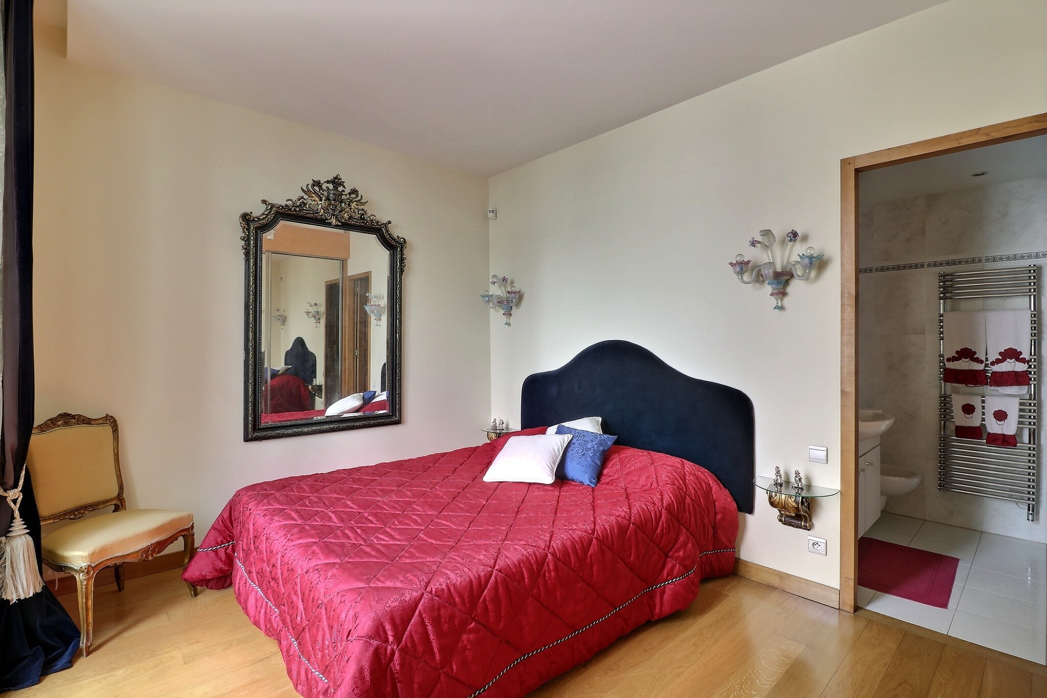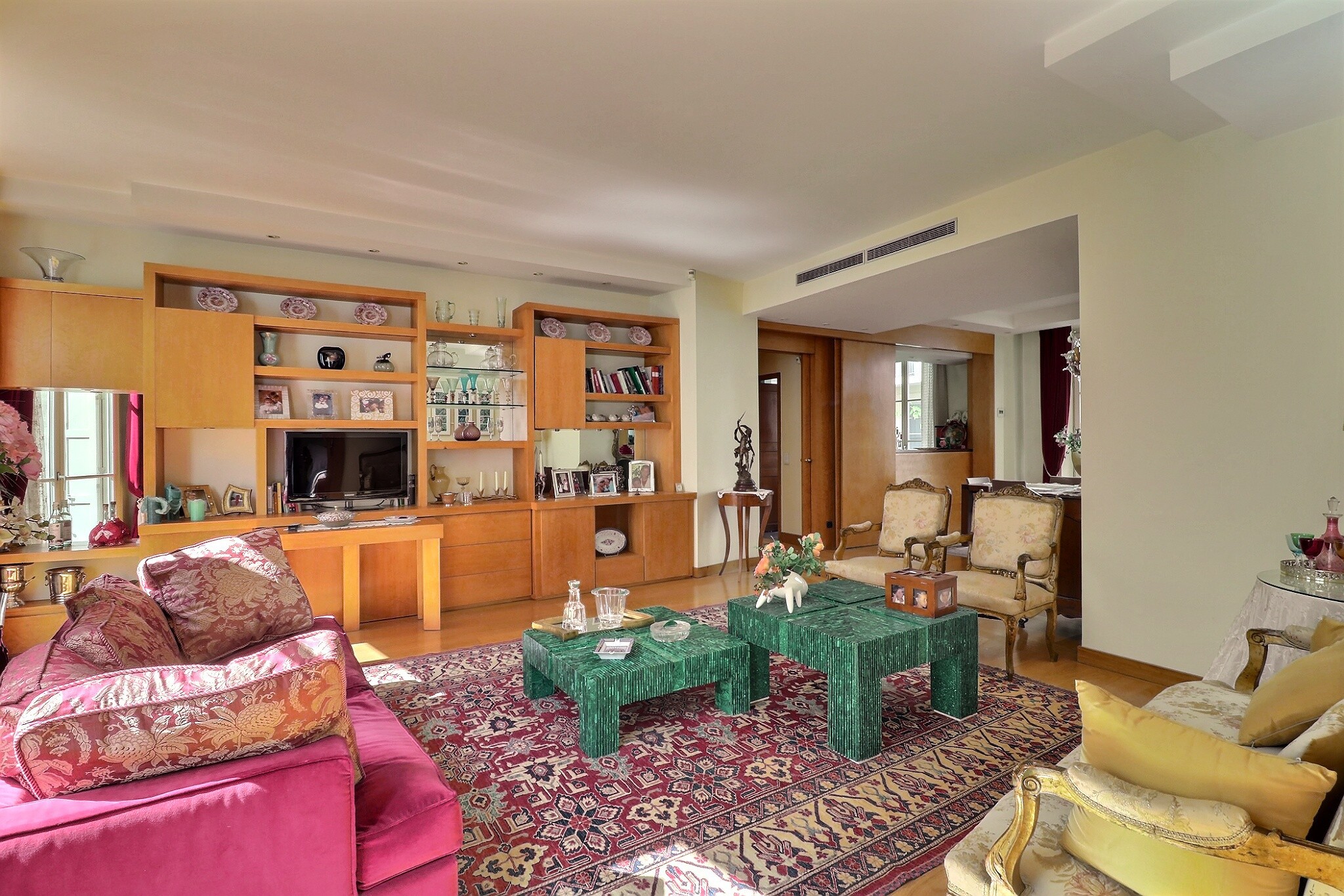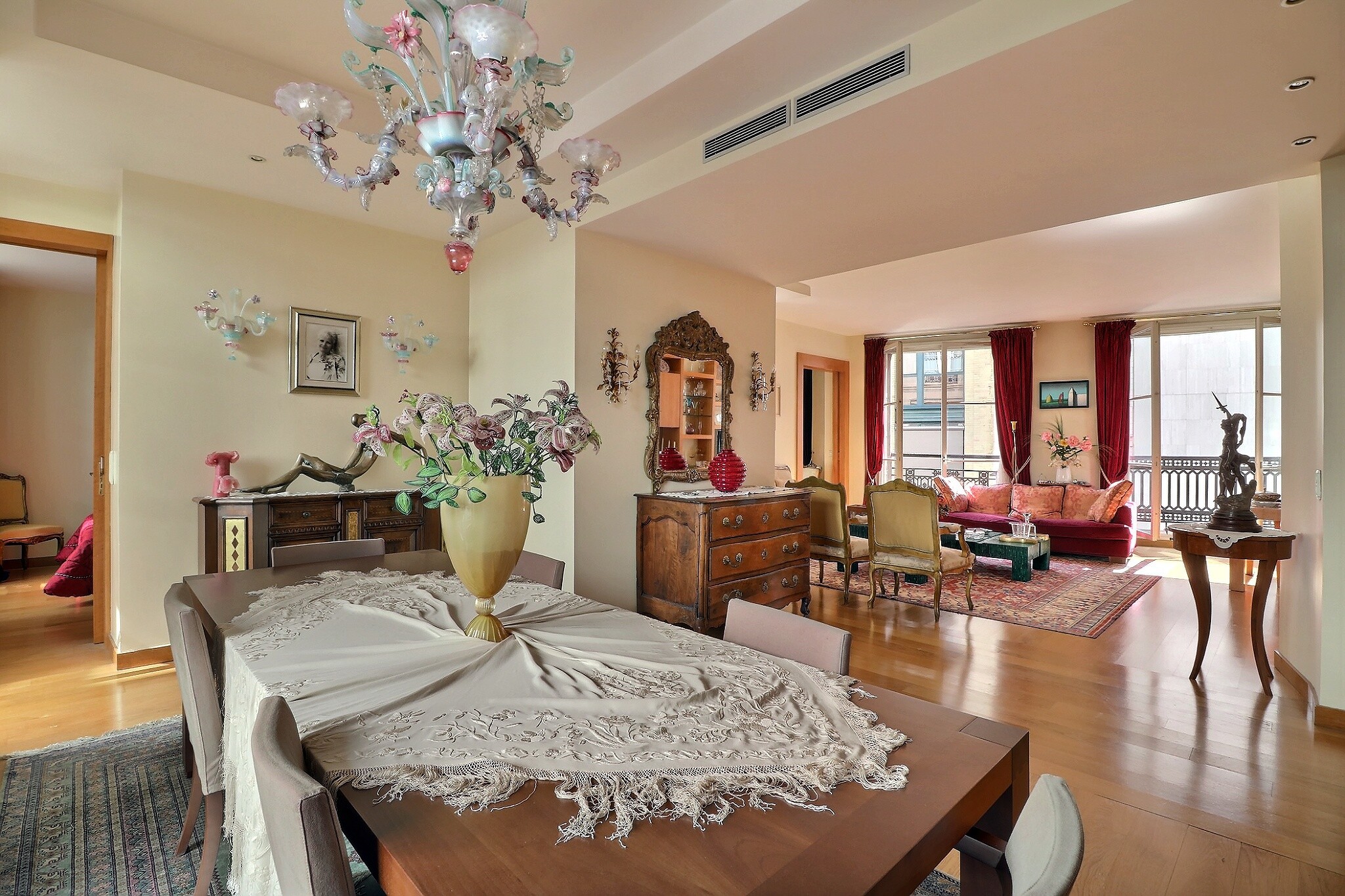 L’appartement profite de nombreux aménagements de confort, tel qu’une climatisation réversible et un système hifi encastré, une bibliothèque et des rangements sur mesure.