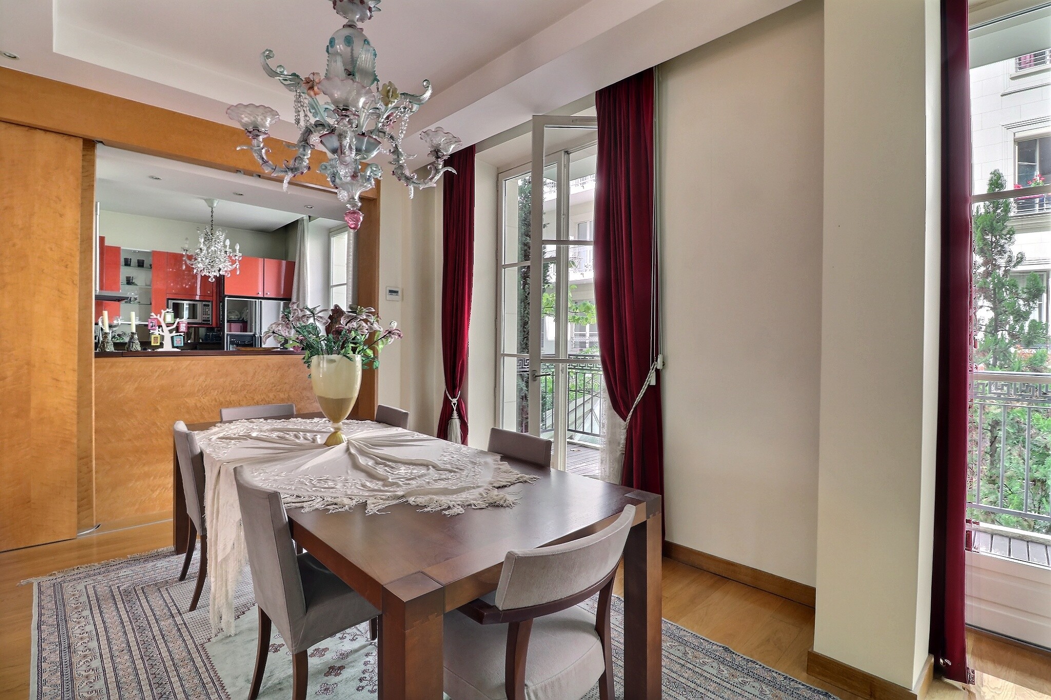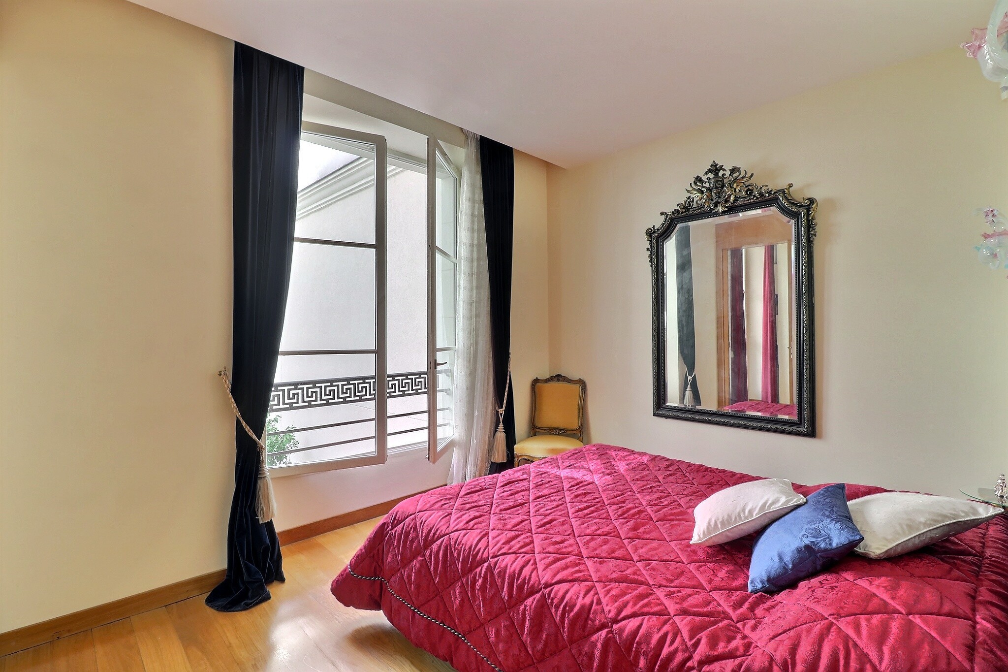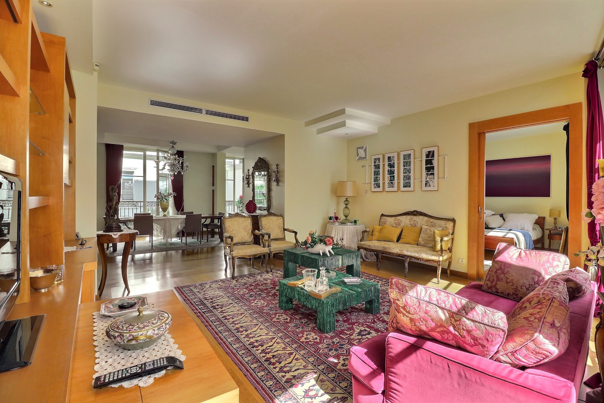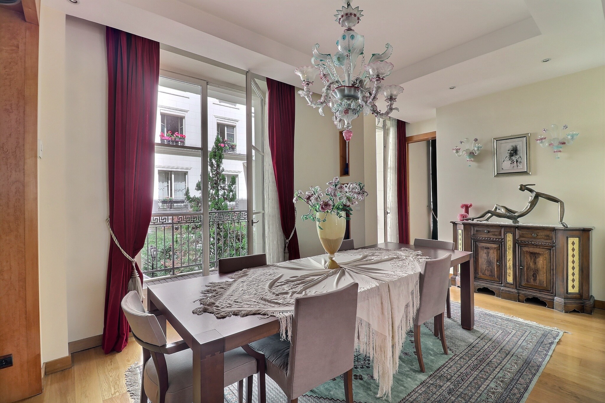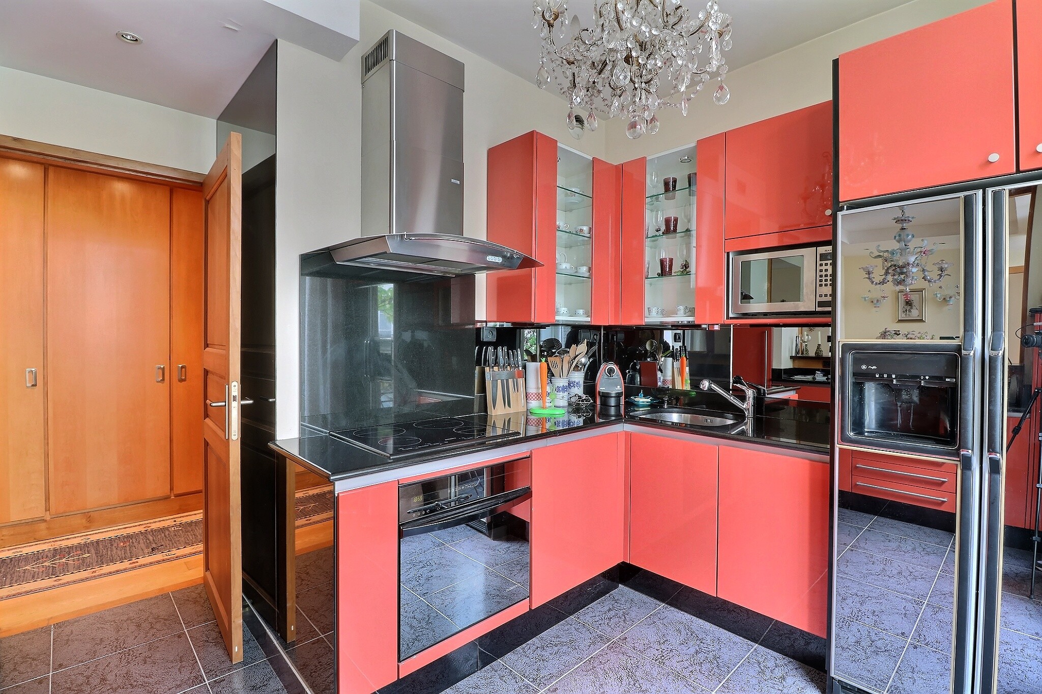 L’appartement profite de nombreux aménagements de confort, tel qu’une climatisation réversible et un système hifi encastré, une bibliothèque et des rangements sur mesure.