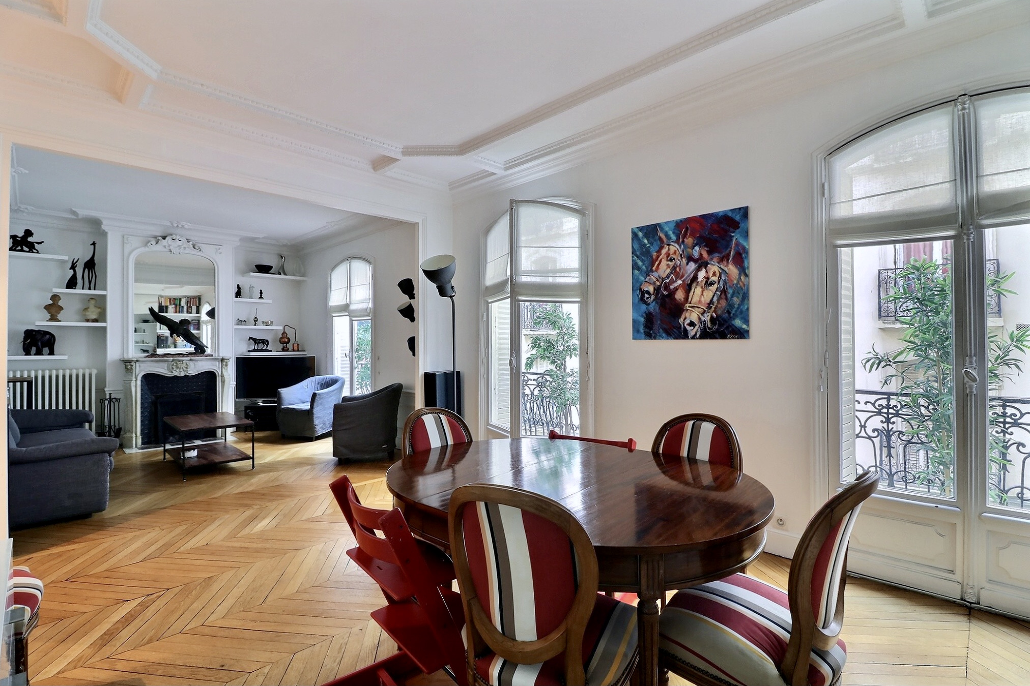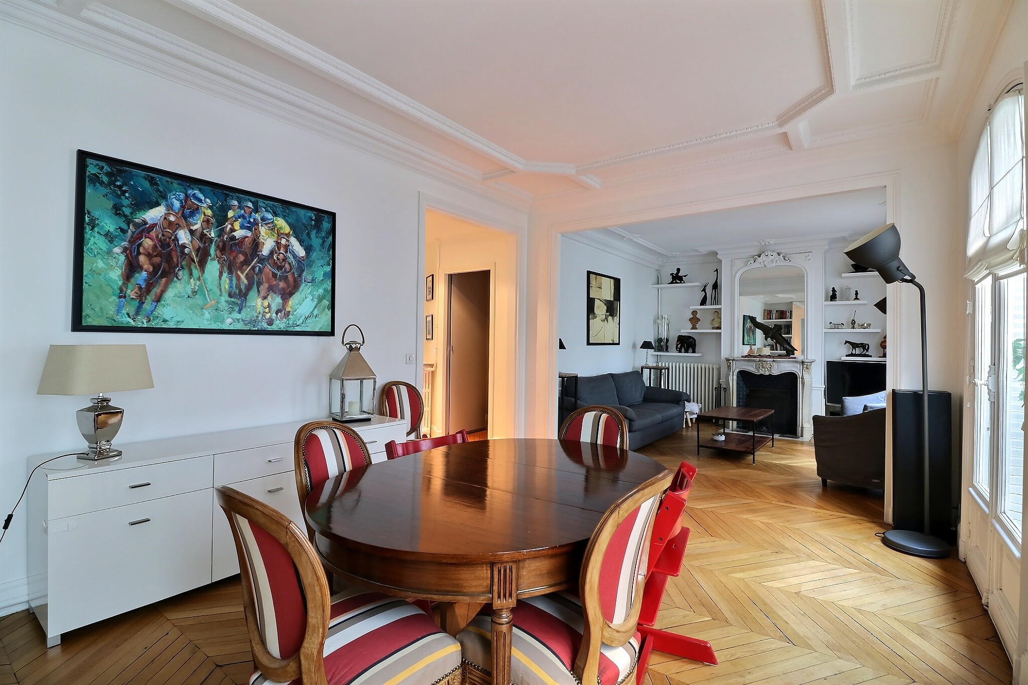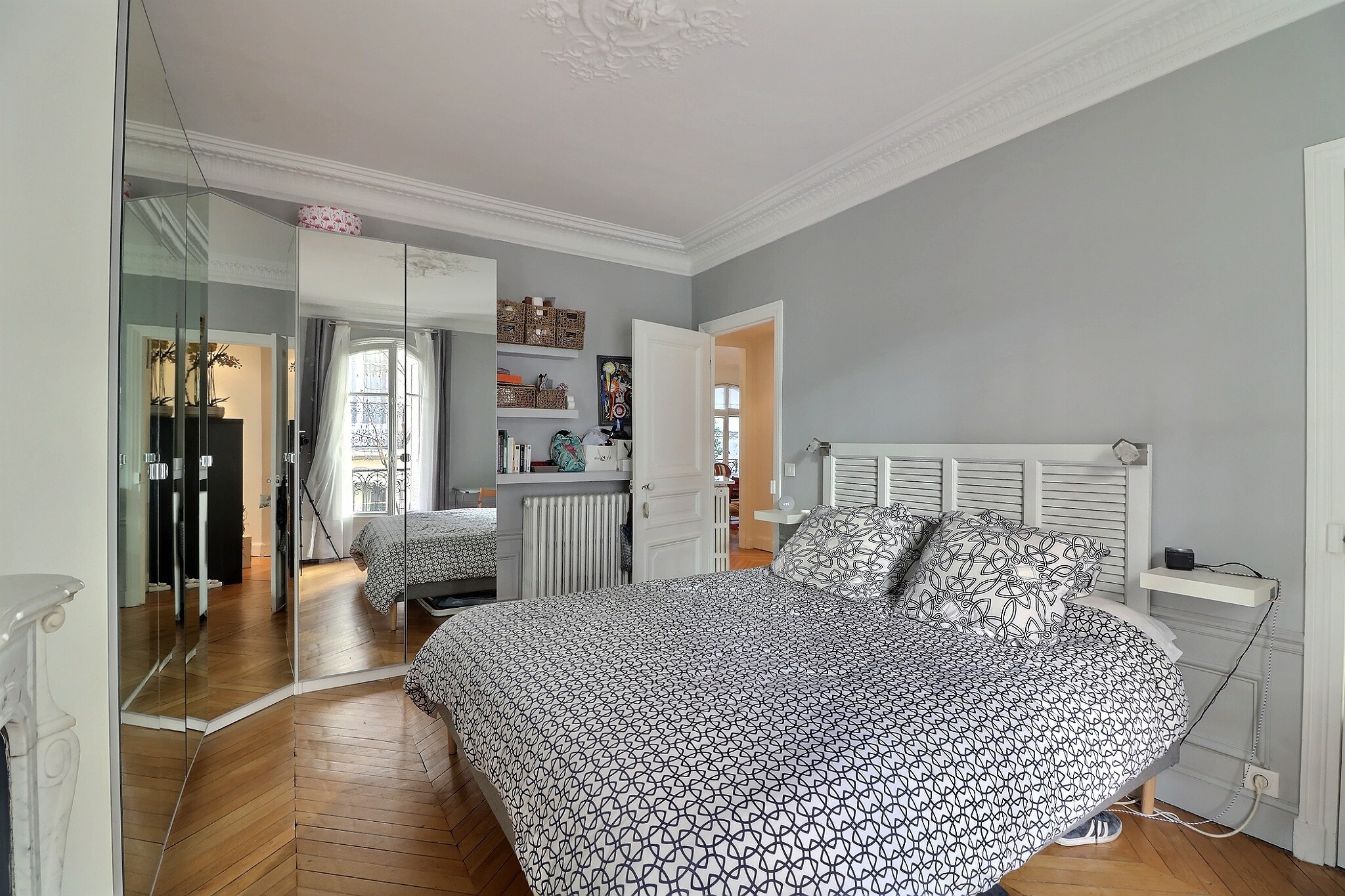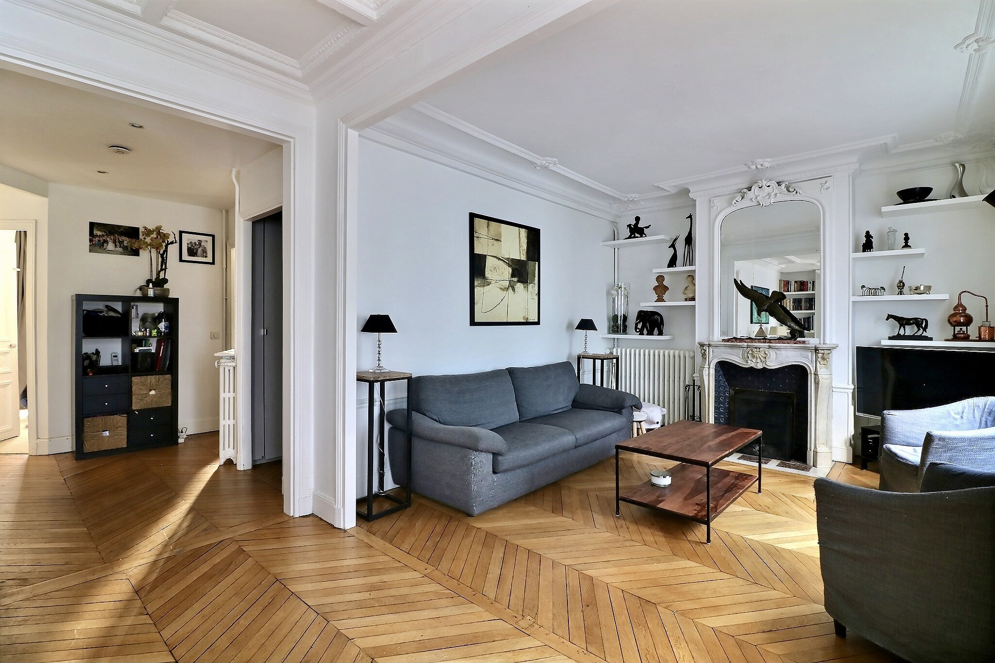 Cet appartement a su conjuguer esprit contemporain et charme de l’ancien avec son parquet point de Hongrie, ses jolies moulures et ses cheminées fonctionnelles.