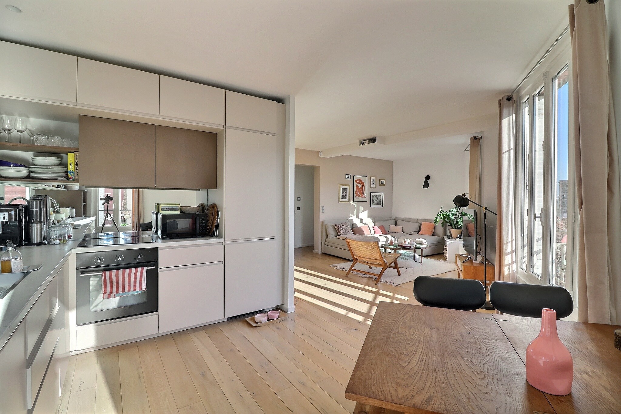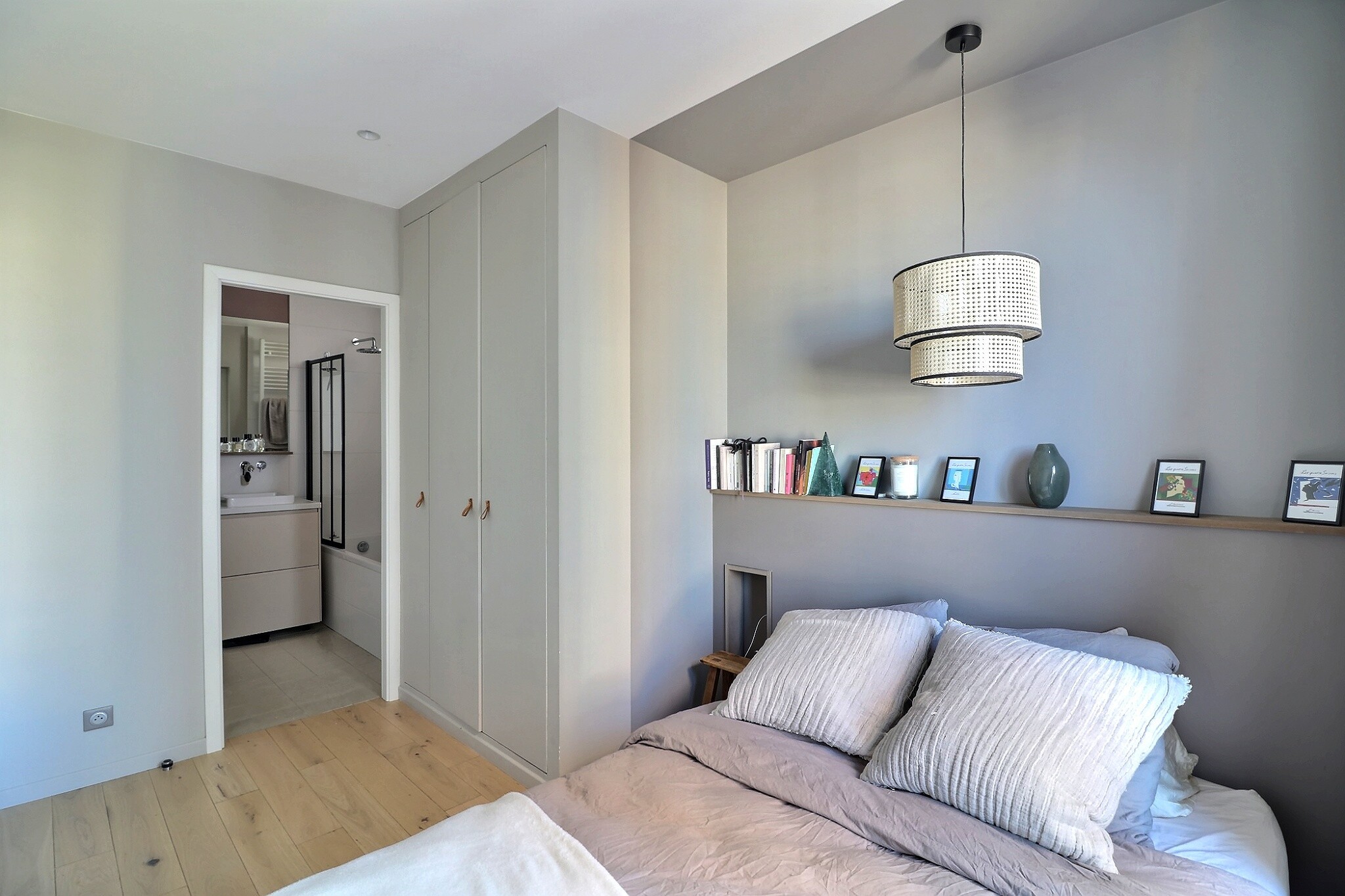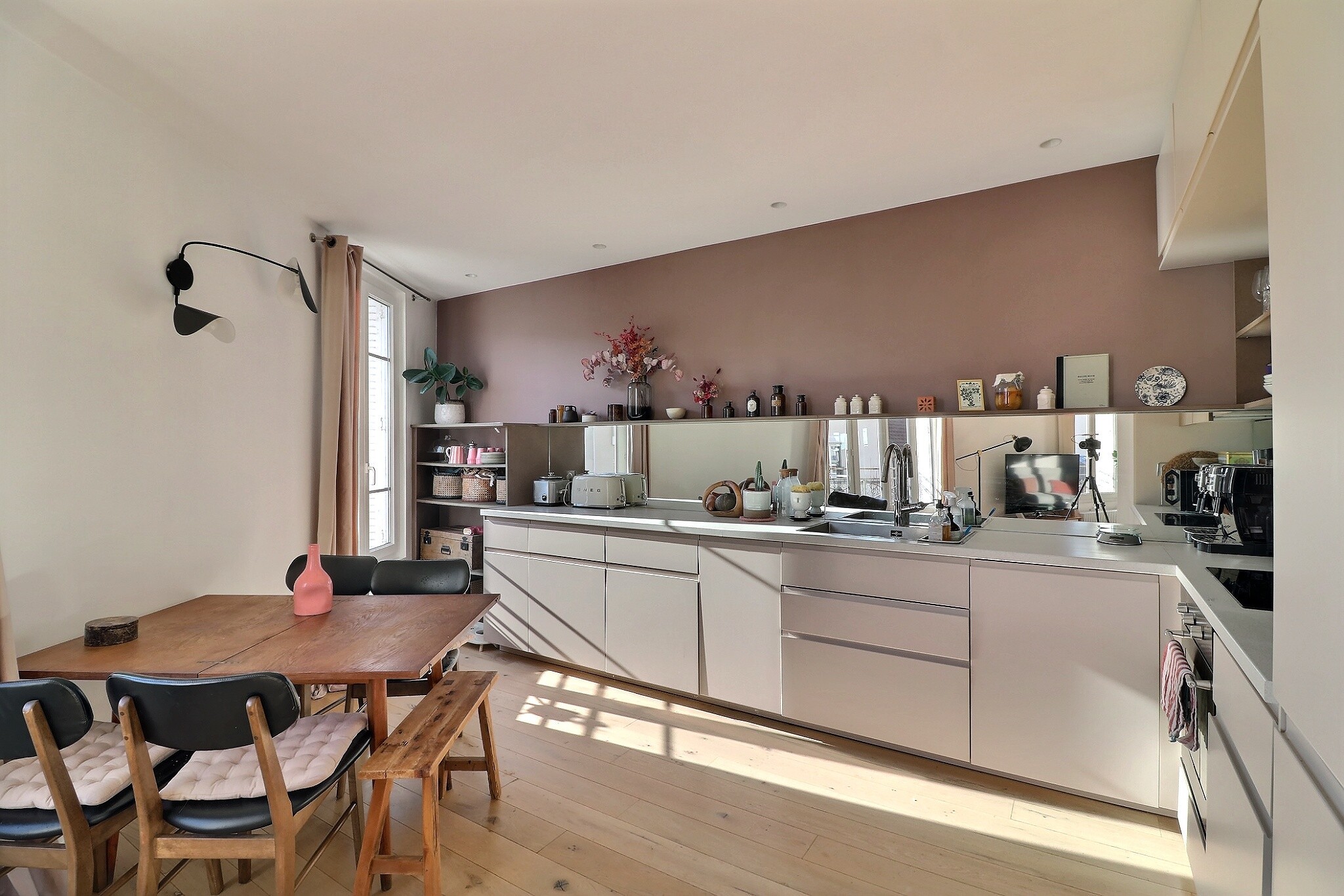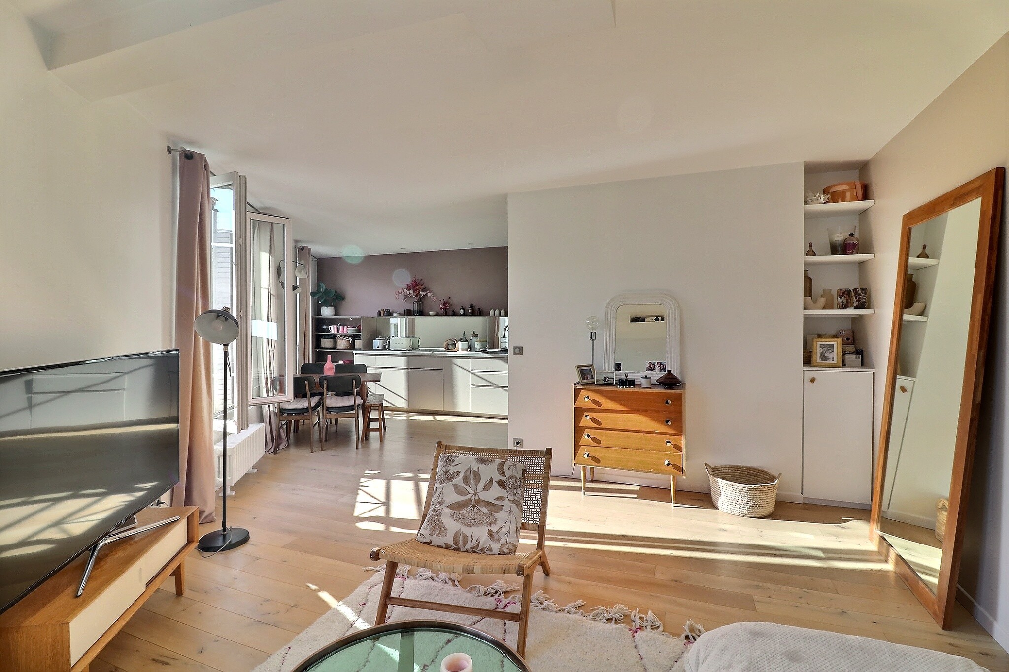 ce 3 pièces est composé d'une entrée, d'une grande pièce de vie avec cuisine ouverte, aménagée et équipée d'une suite parentale au calme sur cour avec des rangements et placards sur-mesure dont une salle de bain attenante, d'une deuxième chambre et d'un toilette indépendant.
