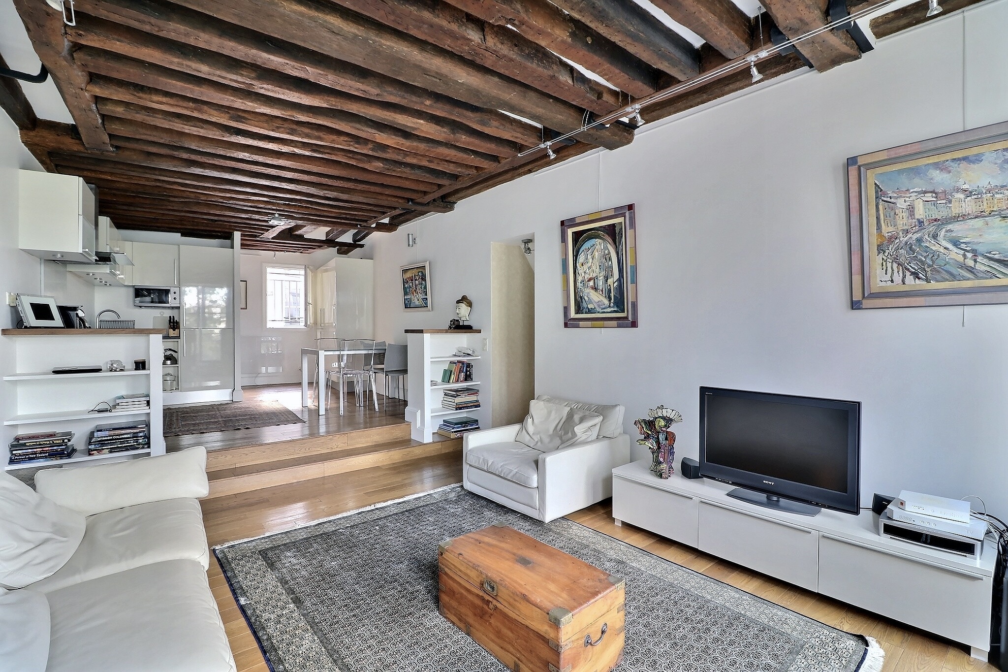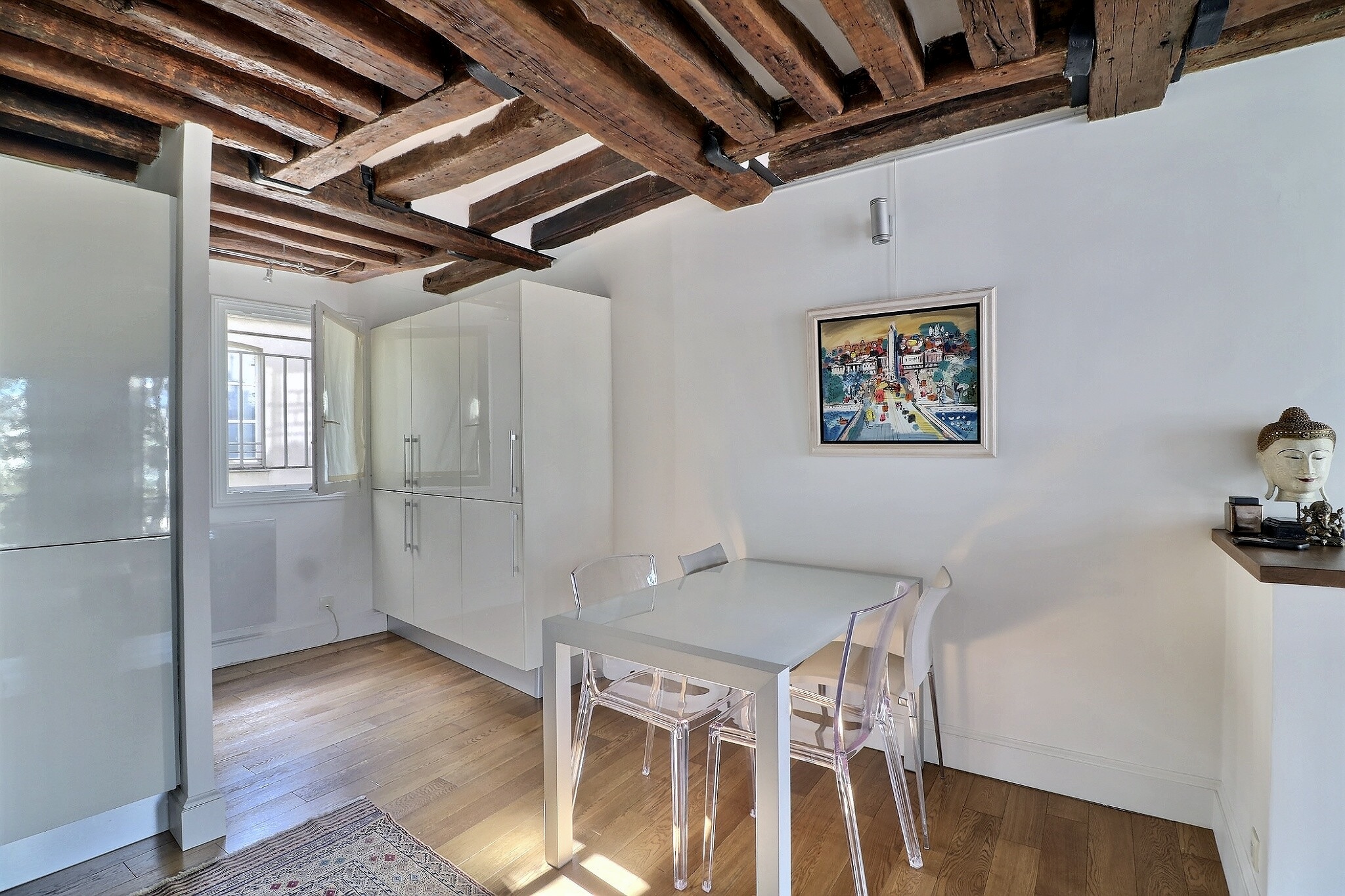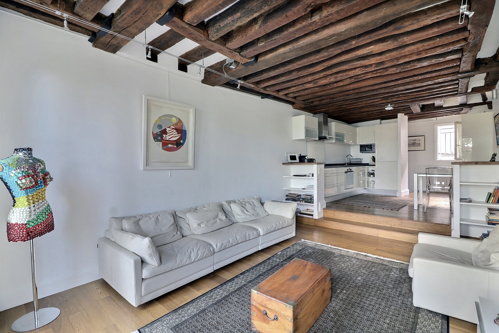 Au 4ème étage ascenseur d'un bel immeuble en pierre de taille, il offre au 1er niveau une entrée, une vaste pièce de vie traversante composée d'un charmant salon aux poutres apparentes et d'un espace cuisine/salle à manger le tout bénéficiant d'une belle hauteur sous plafond de près de 3m et d'une très belle vue dégagée sur Beaubourg.