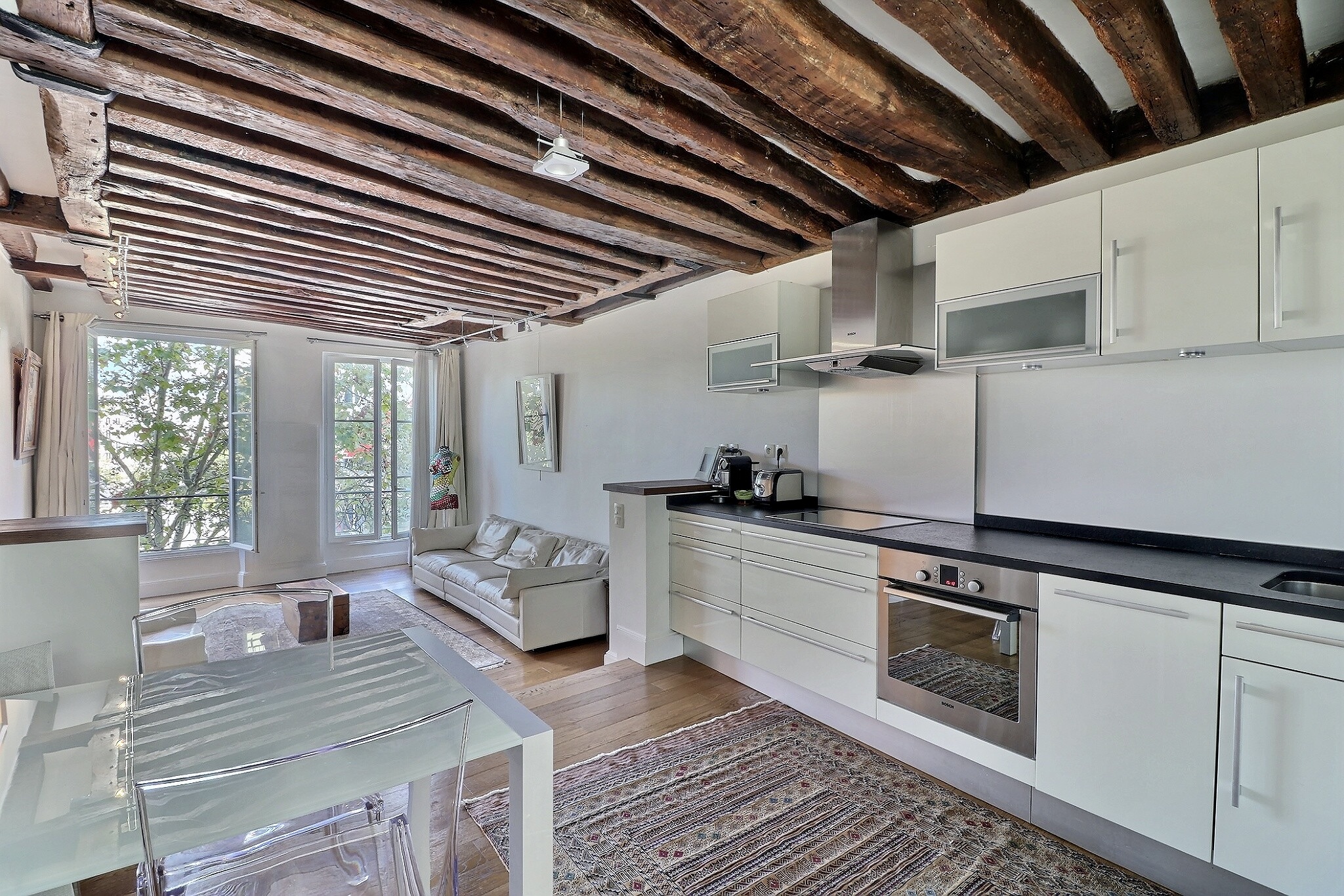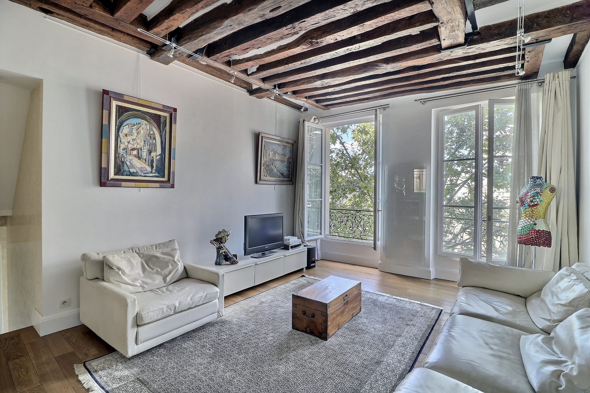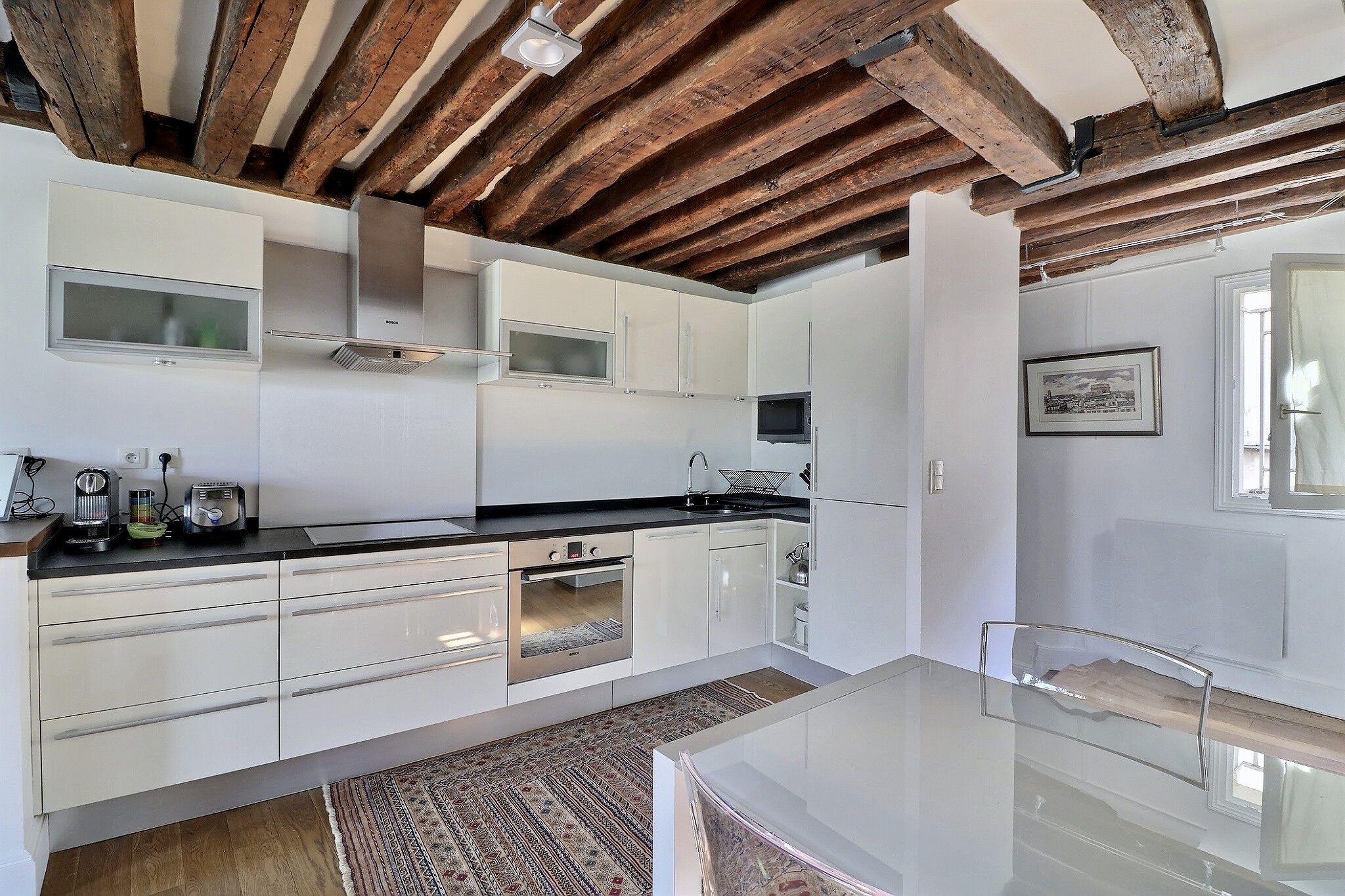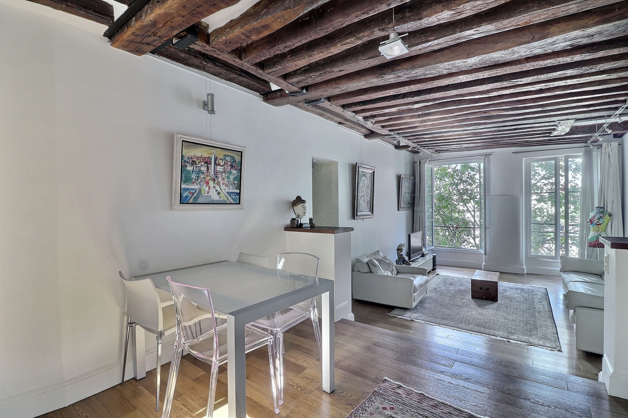 Au 4ème étage ascenseur d'un bel immeuble en pierre de taille, il offre au 1er niveau une entrée, une vaste pièce de vie traversante composée d'un charmant salon aux poutres apparentes et d'un espace cuisine/salle à manger le tout bénéficiant d'une belle hauteur sous plafond de près de 3m et d'une très belle vue dégagée sur Beaubourg.