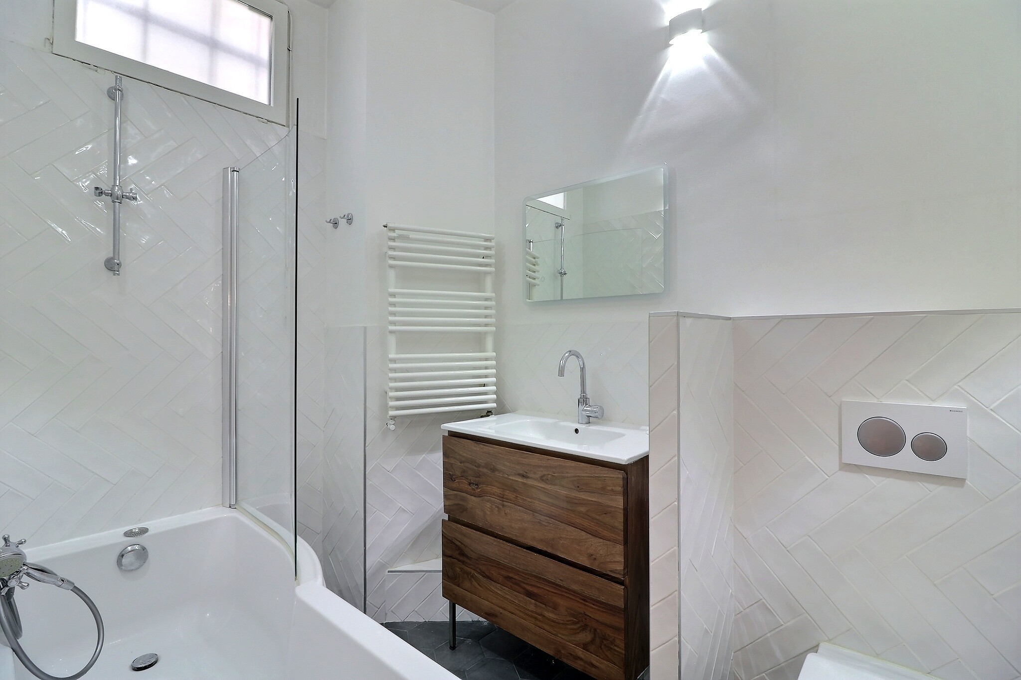 Entièrement refait par architecte, un 4 pièces traversant composé au RDC d'un vaste séjour, d'une cuisine séparée aménagée et équipée haut de gamme, de deux chambres avec de nombreux rangements, un dressing, une de salle de bains et un toilette.