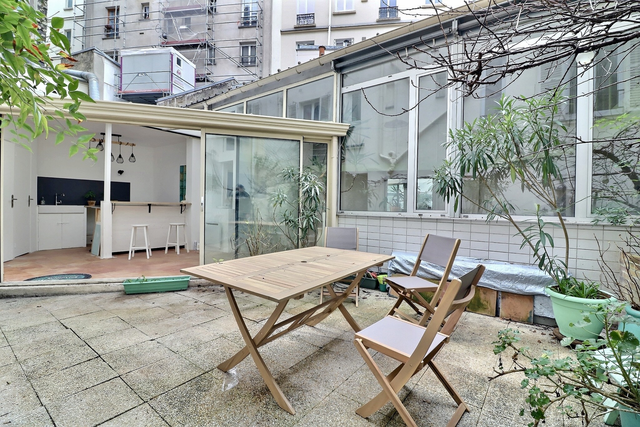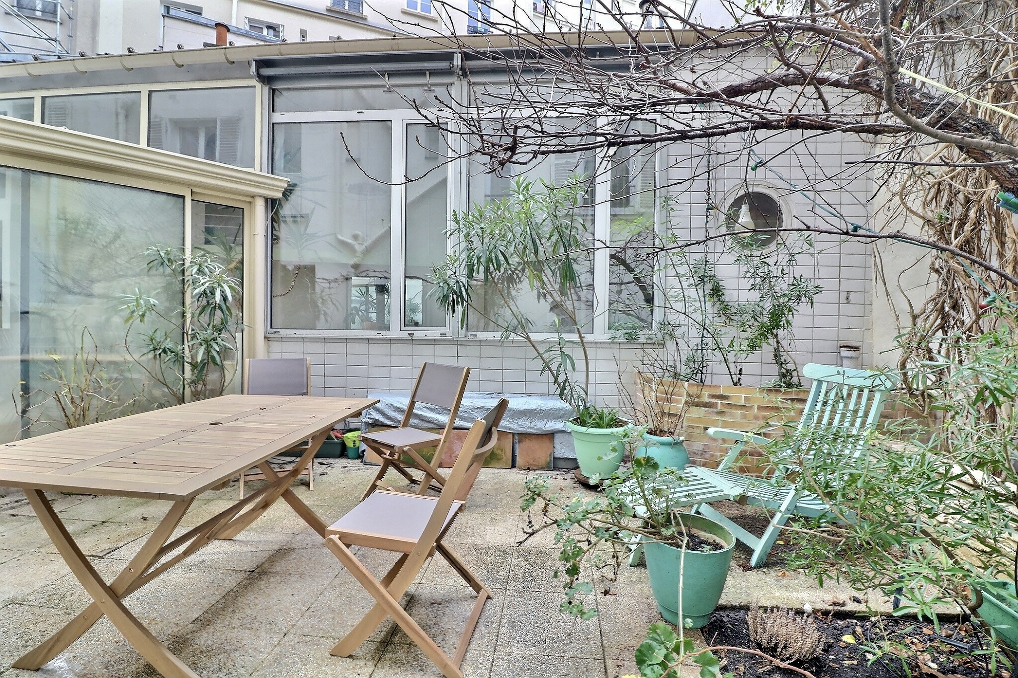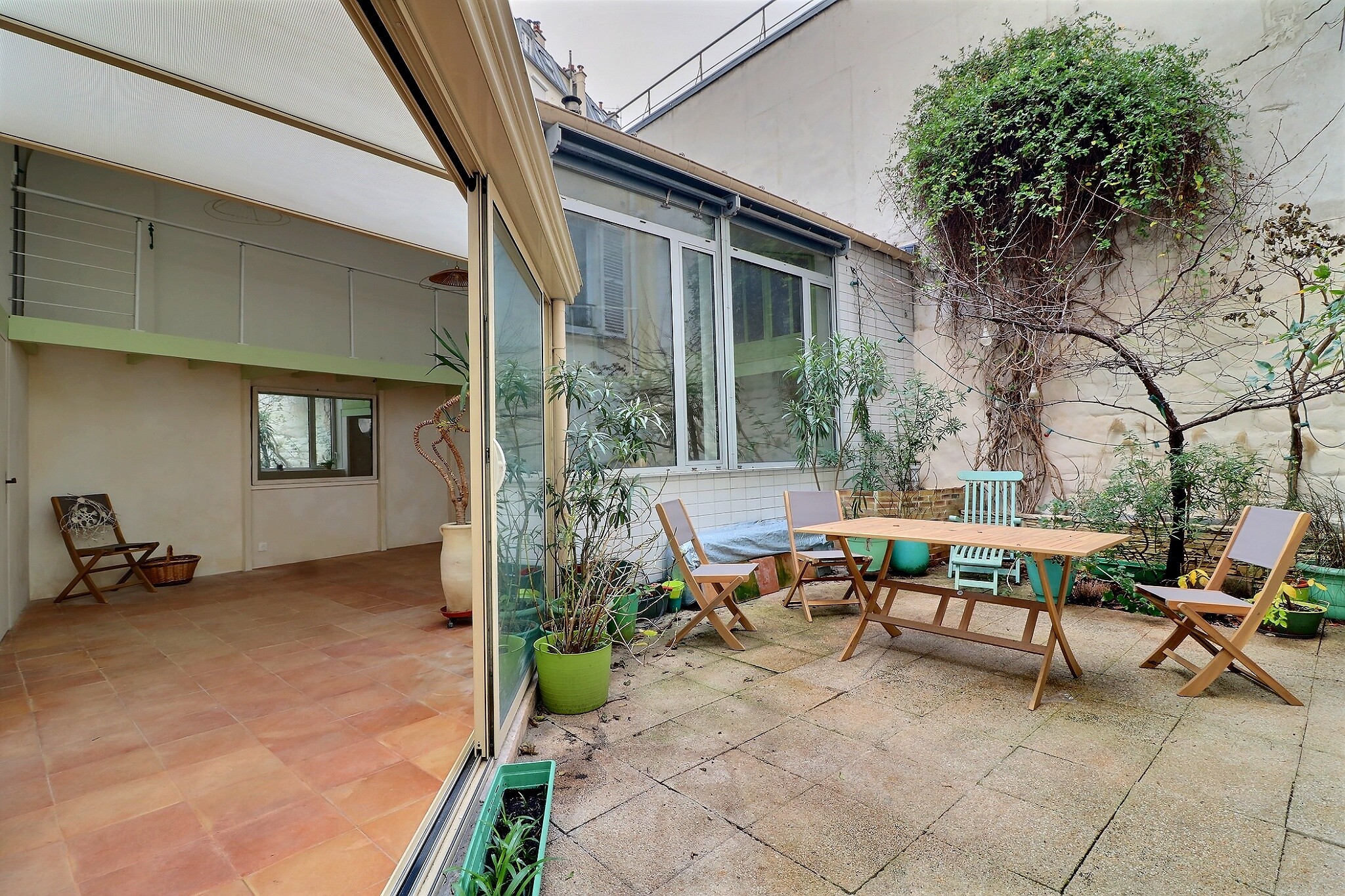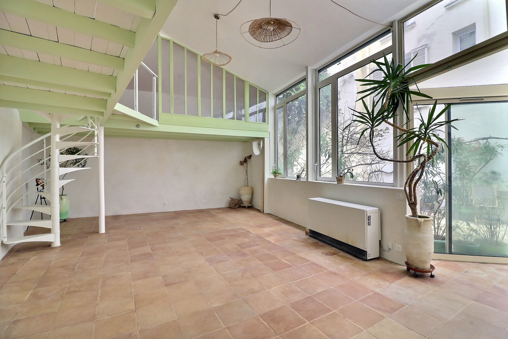 Ancien atelier comme une maison au calme absolu et à l'abri des regards situé dans le village Ramey proche métro. Ce bien d'exception donnant sur un jardin privatif en pleine propriété, vous apprécierez un lieu unique très ouvert plein de lumière et avec une très belle hauteur sous plafond de 5m (env); Parefeuille de terre cuite au sol chauffant + chauffage à briques réfractaires très efficace, chaleur douce et enveloppante