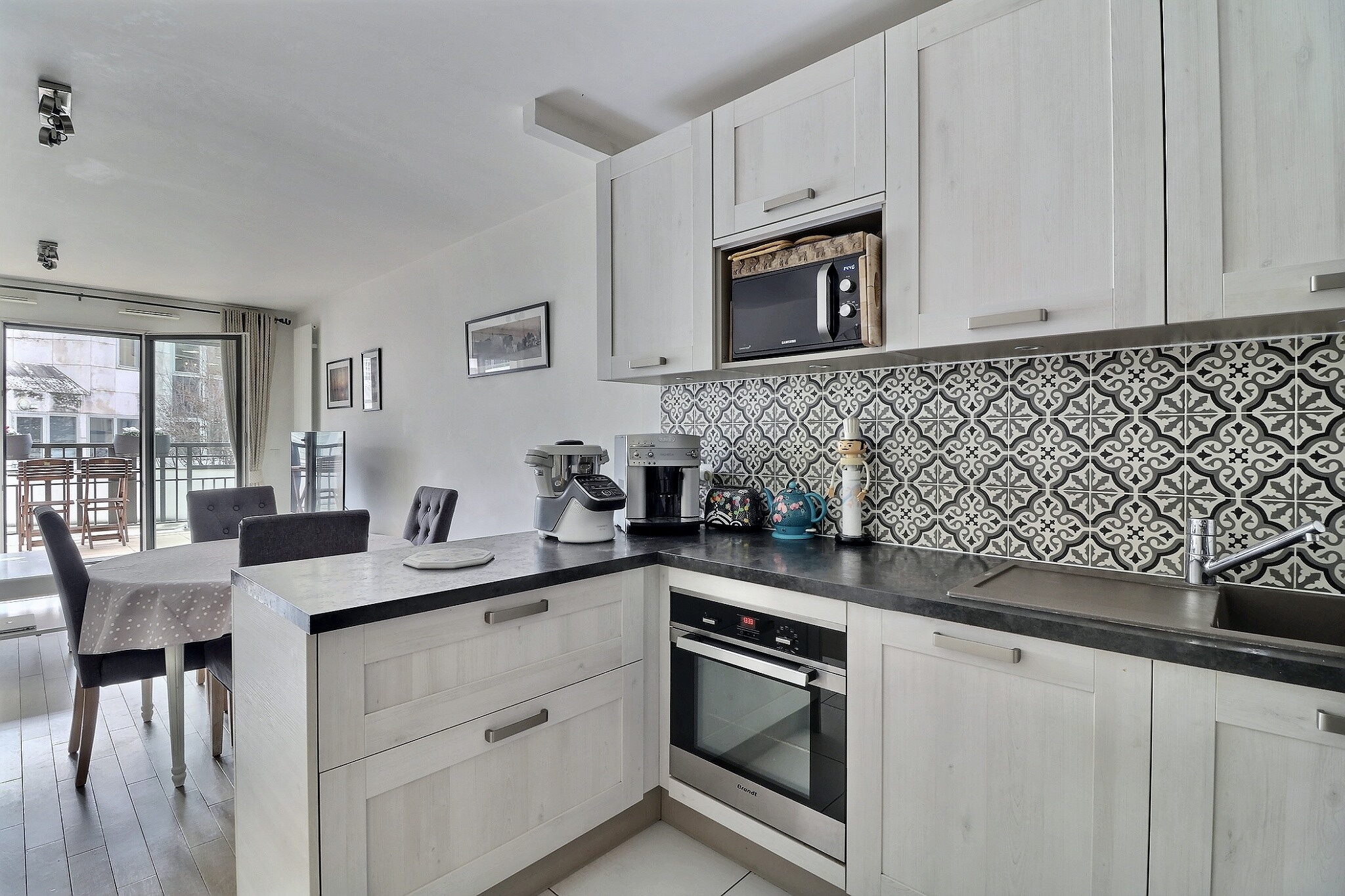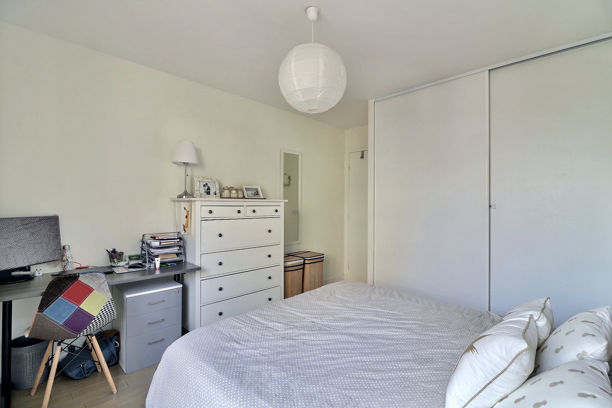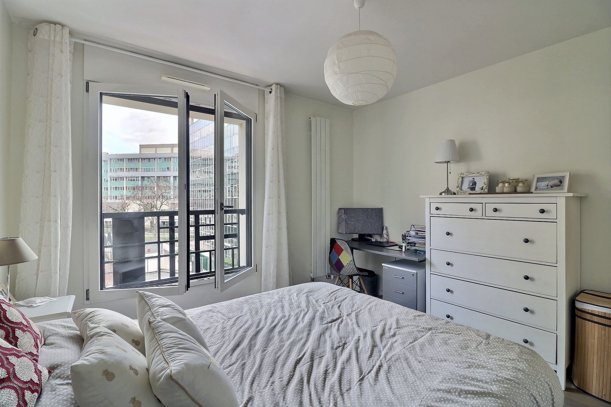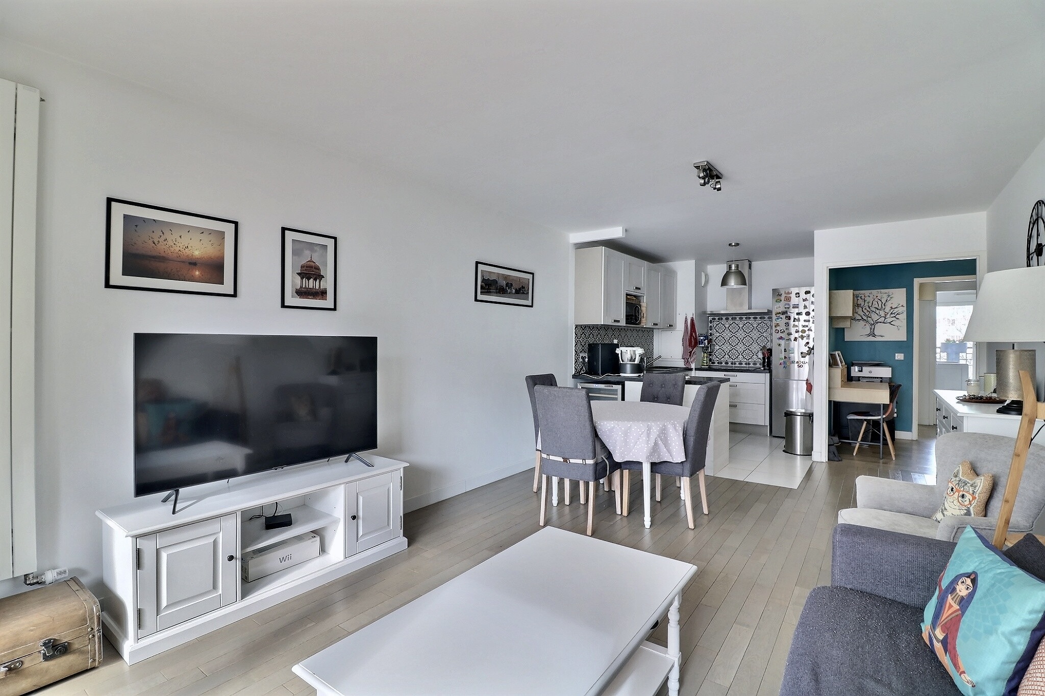 En parfait état, cet appartement est composé d'une entrée avec un espace bureau avec des placards sur mesure, d’un séjour/salle à manger donnant sur un grand balcon exposé plein Sud au calme sur jardin et sans vis à vis, d’une cuisine ouverte entièrement aménagée et équipée.
