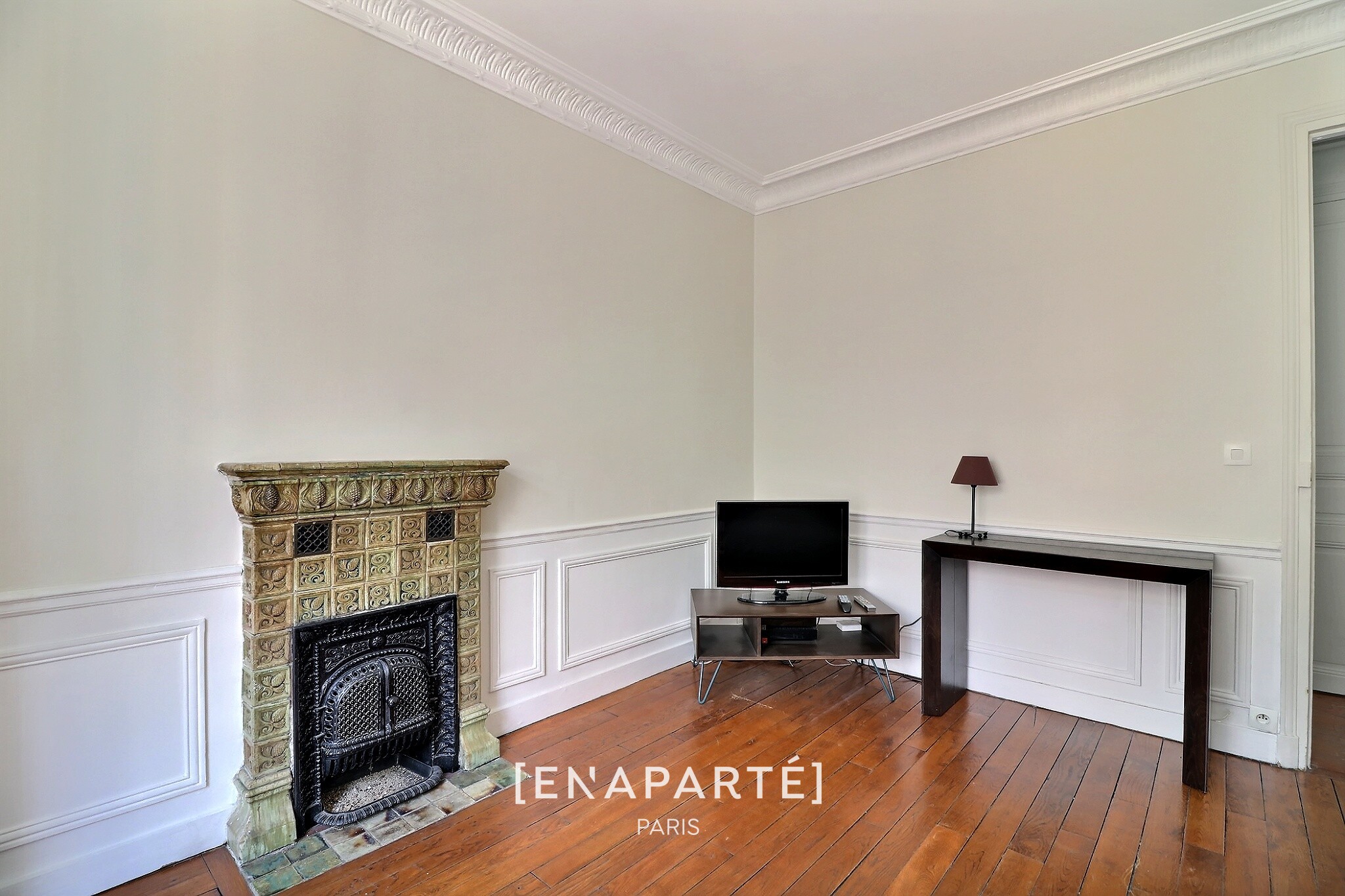 Appartement de charme typiquement parisien avec son parquet, ses moulures et sa cheminée prussienne.