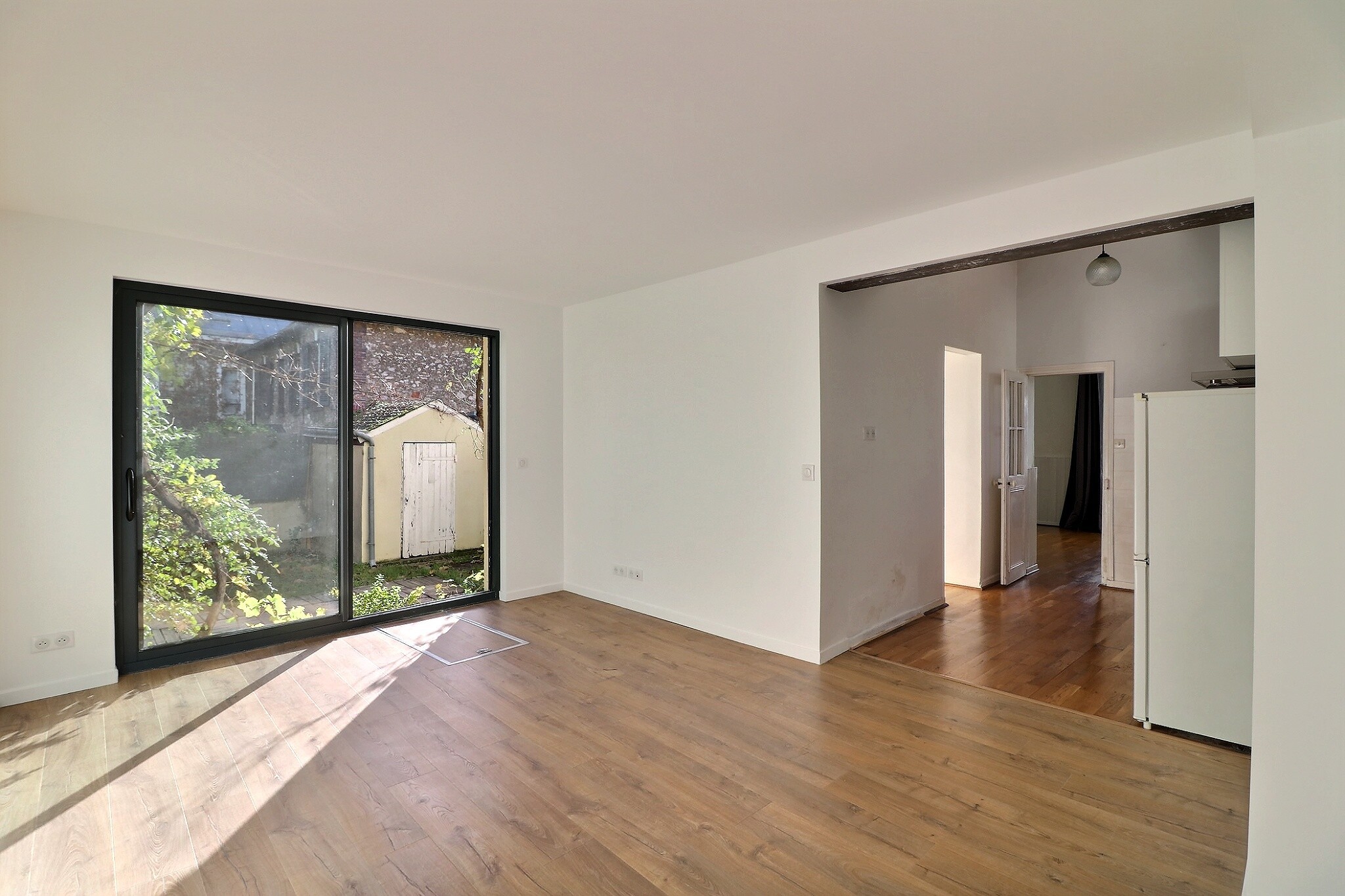 Au rez-de-jardin : Une entrée, un séjour avec une grande baie vitrée donnant accès à la terrasse et au jardin arboré, un toilette indépendant, une cuisine ouverte entièrement aménagée, une chambre avec des rangements et un escalier qui mène à l’étage.