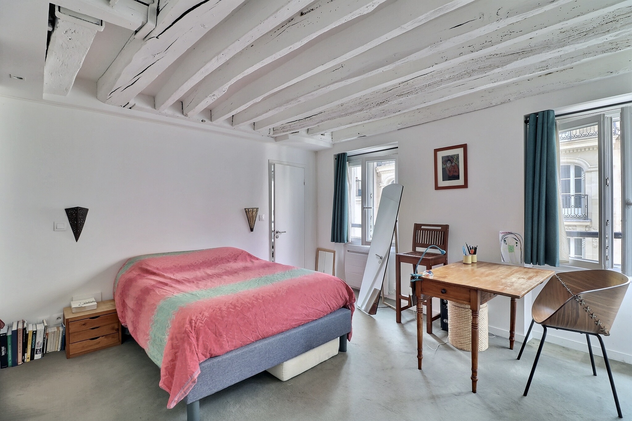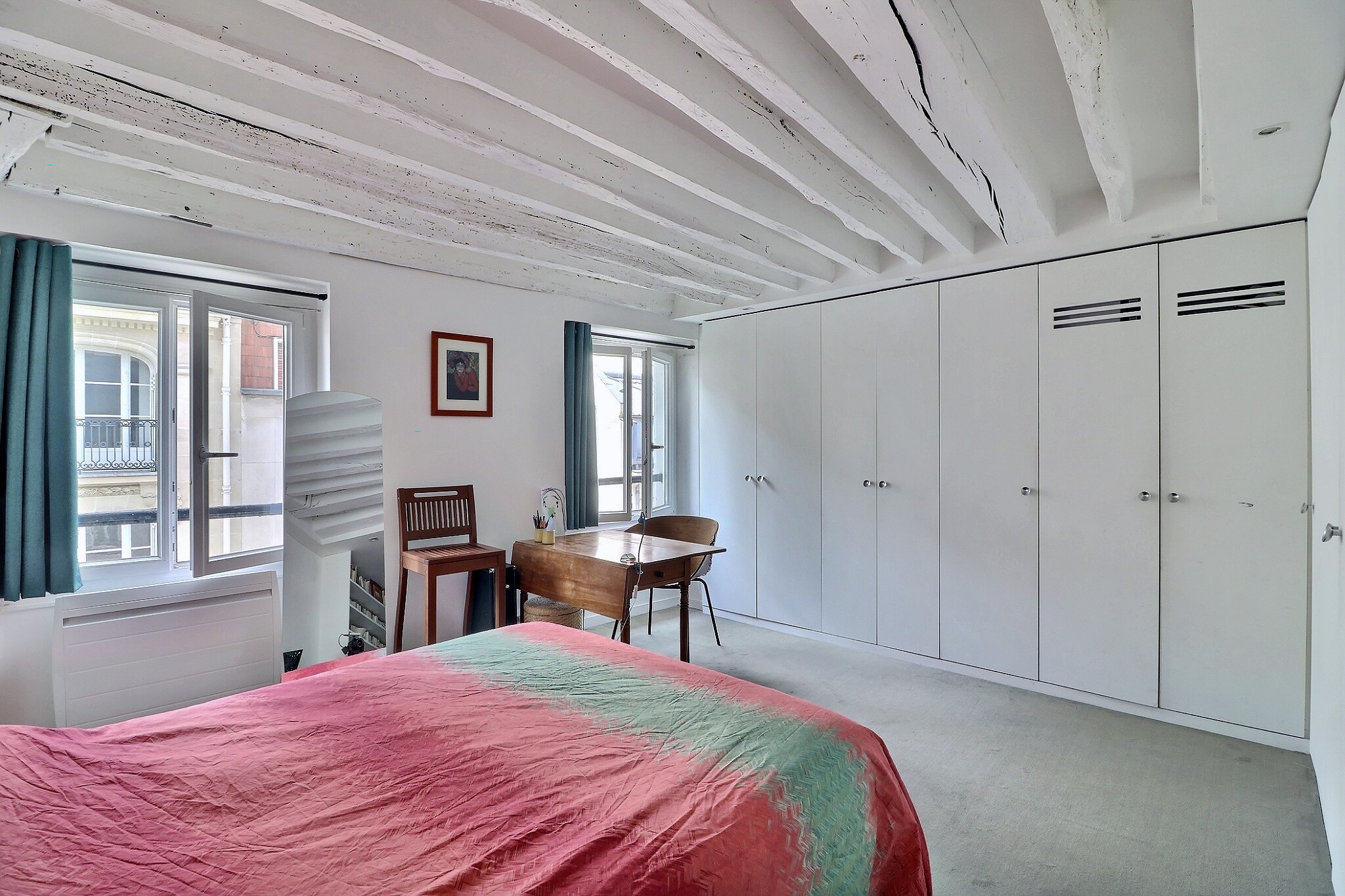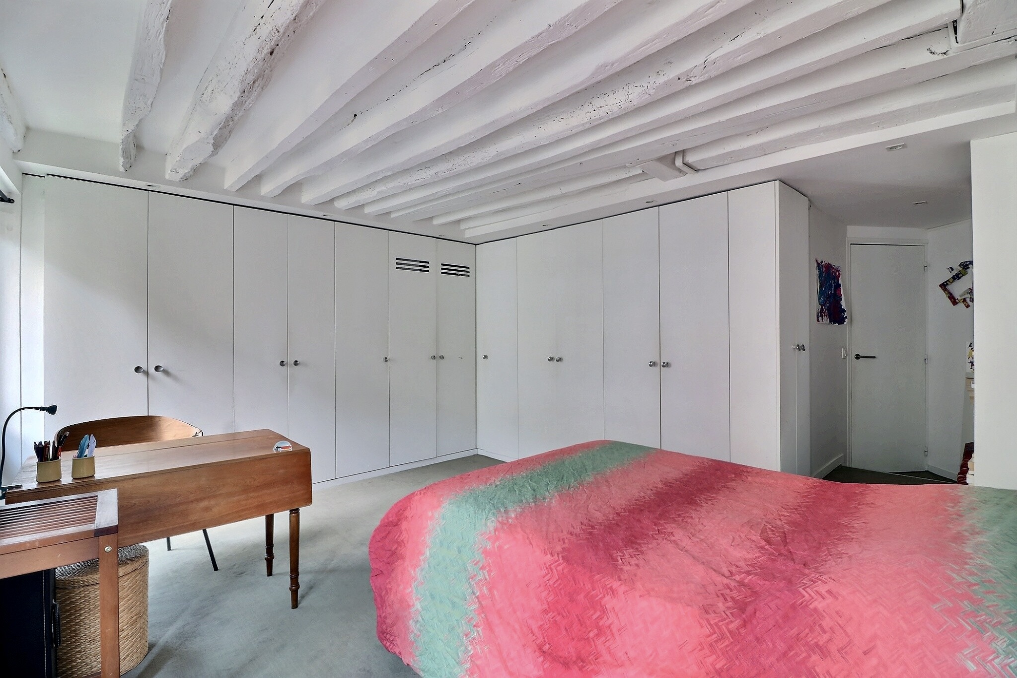 L'appartement comprend au premier niveau : Une entrée, deux chambres dont une avec placard donnant sur rue et cour pavée, un espace de rangements sous l'escalier, une salle de bain et un toilette indépendant.