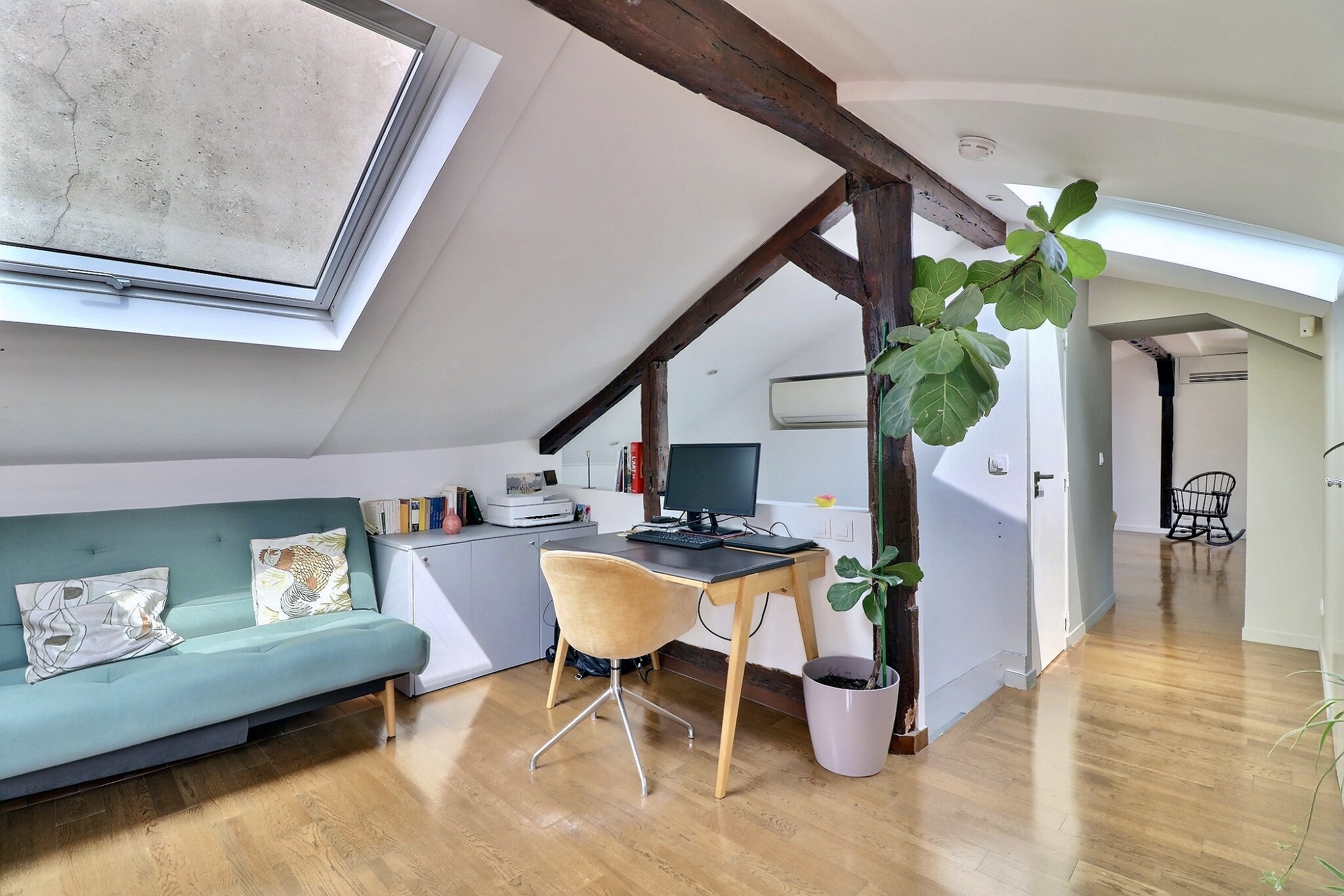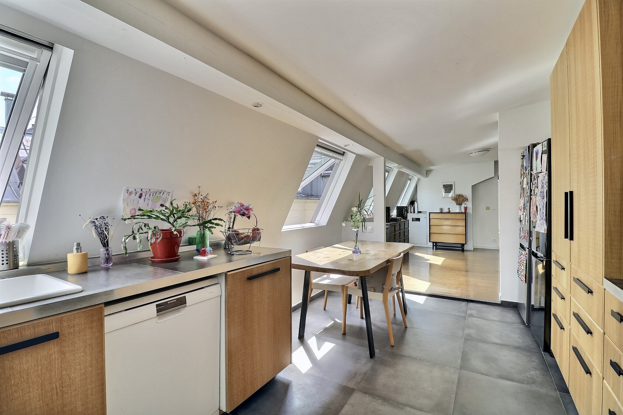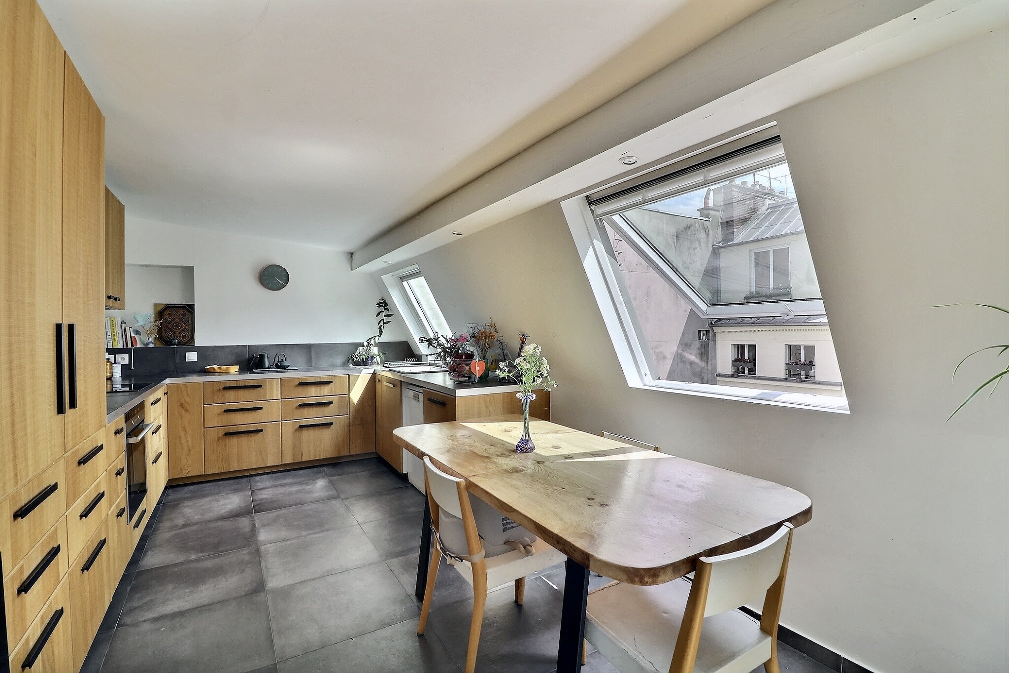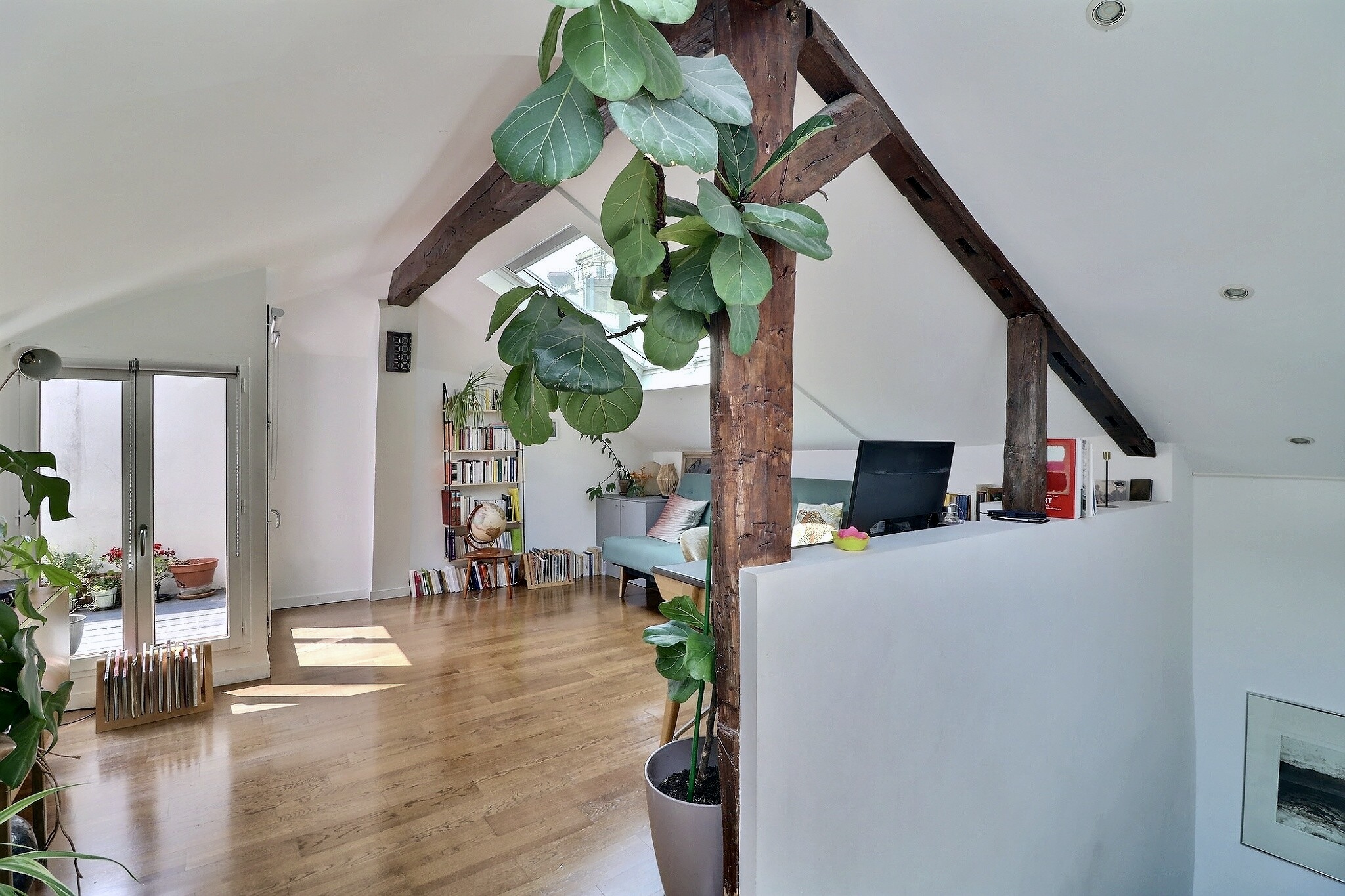 Un duplex Situé au 5ème et 6ème étage (derniers étages) d'un immeuble en pierre de Paris parfaitement entretenu.