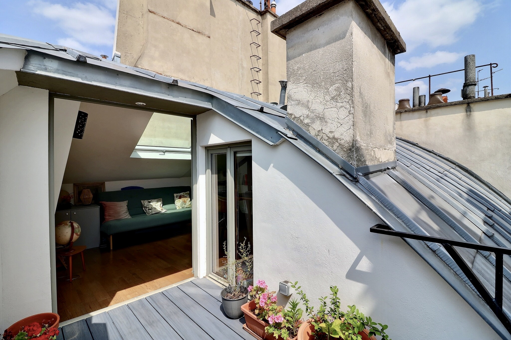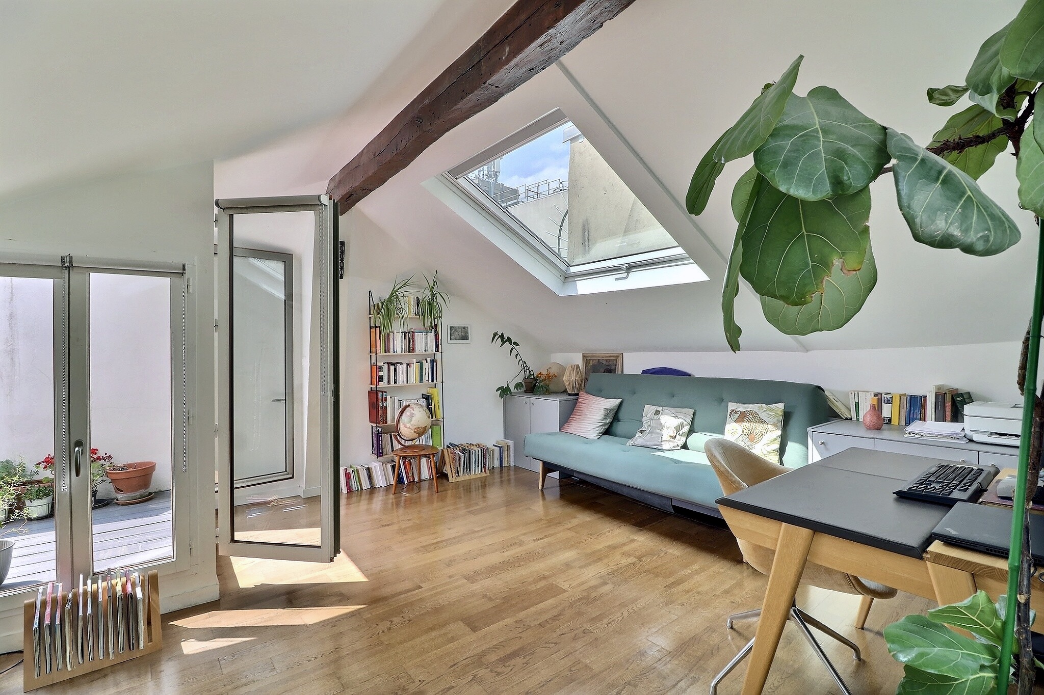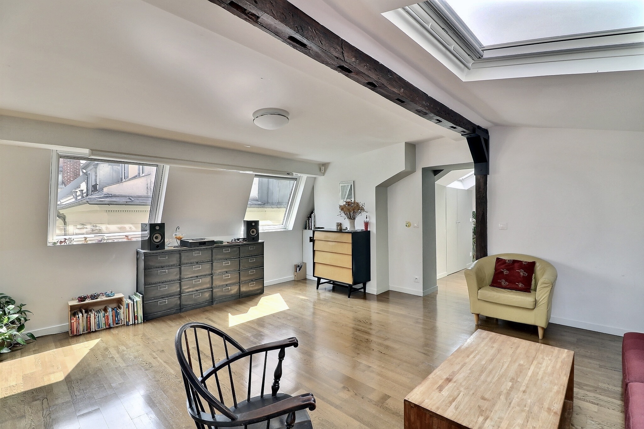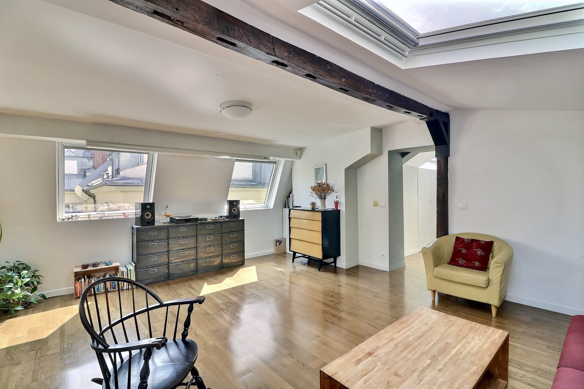 Un duplex Situé au 5ème et 6ème étage (derniers étages) d'un immeuble en pierre de Paris parfaitement entretenu.