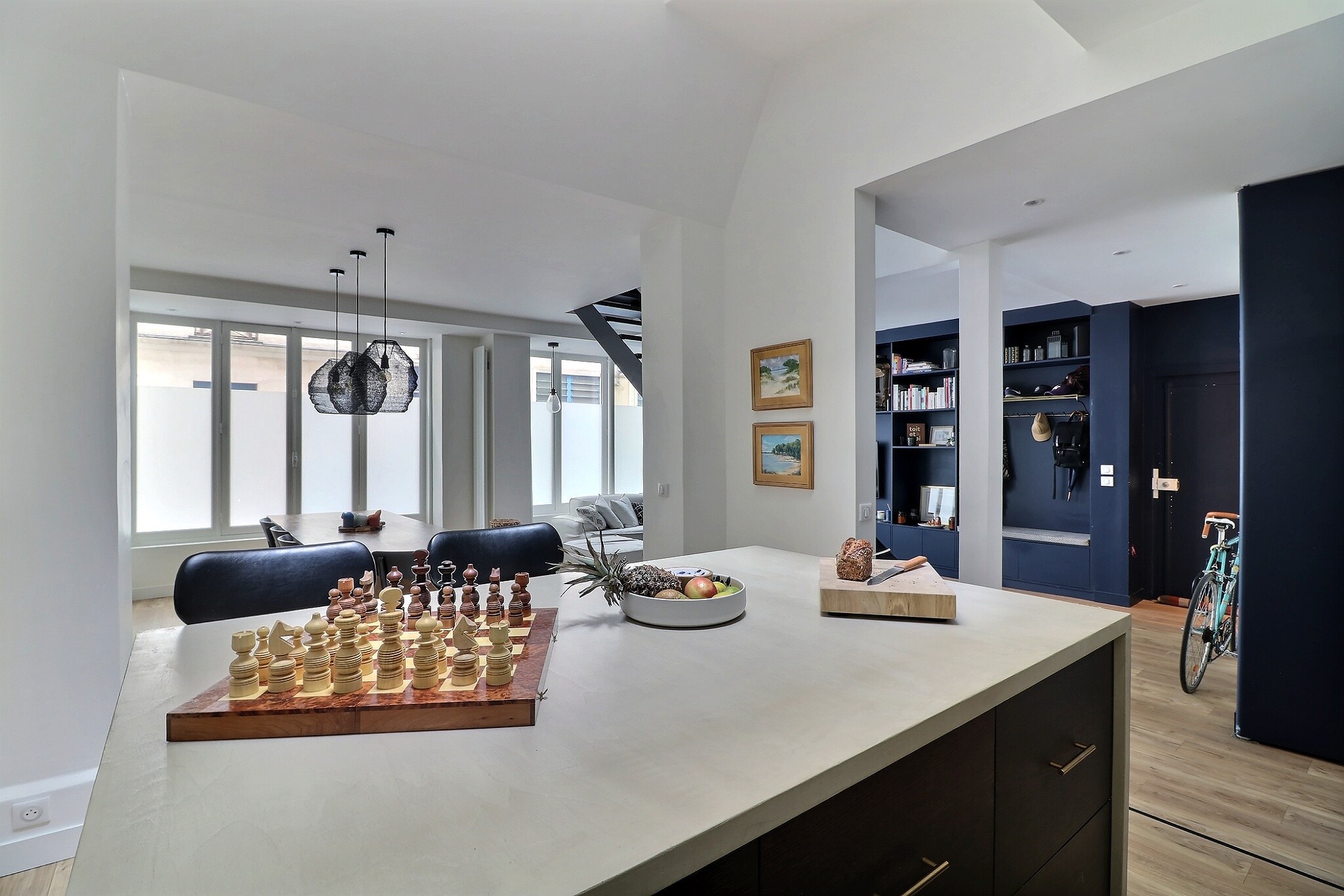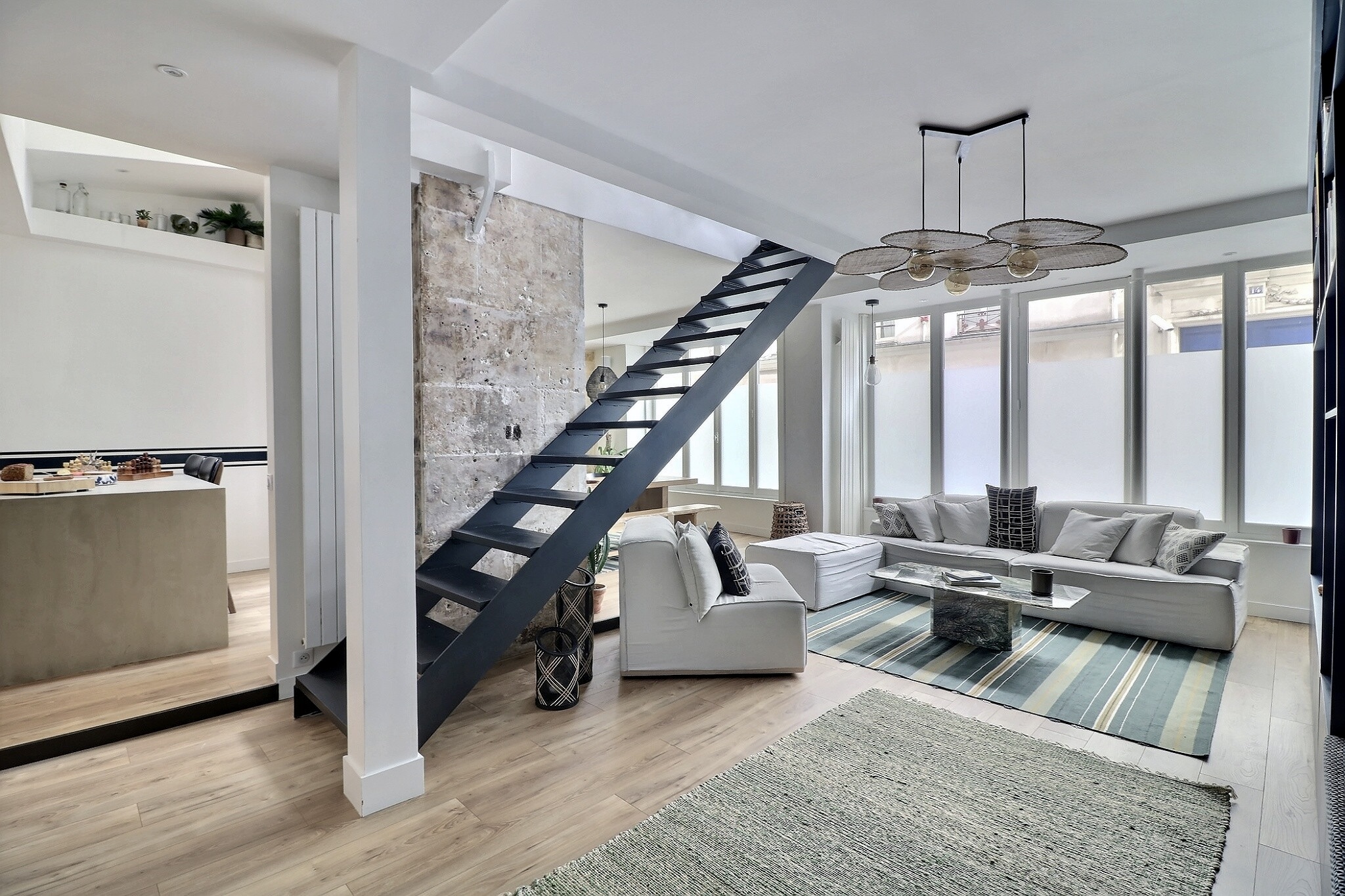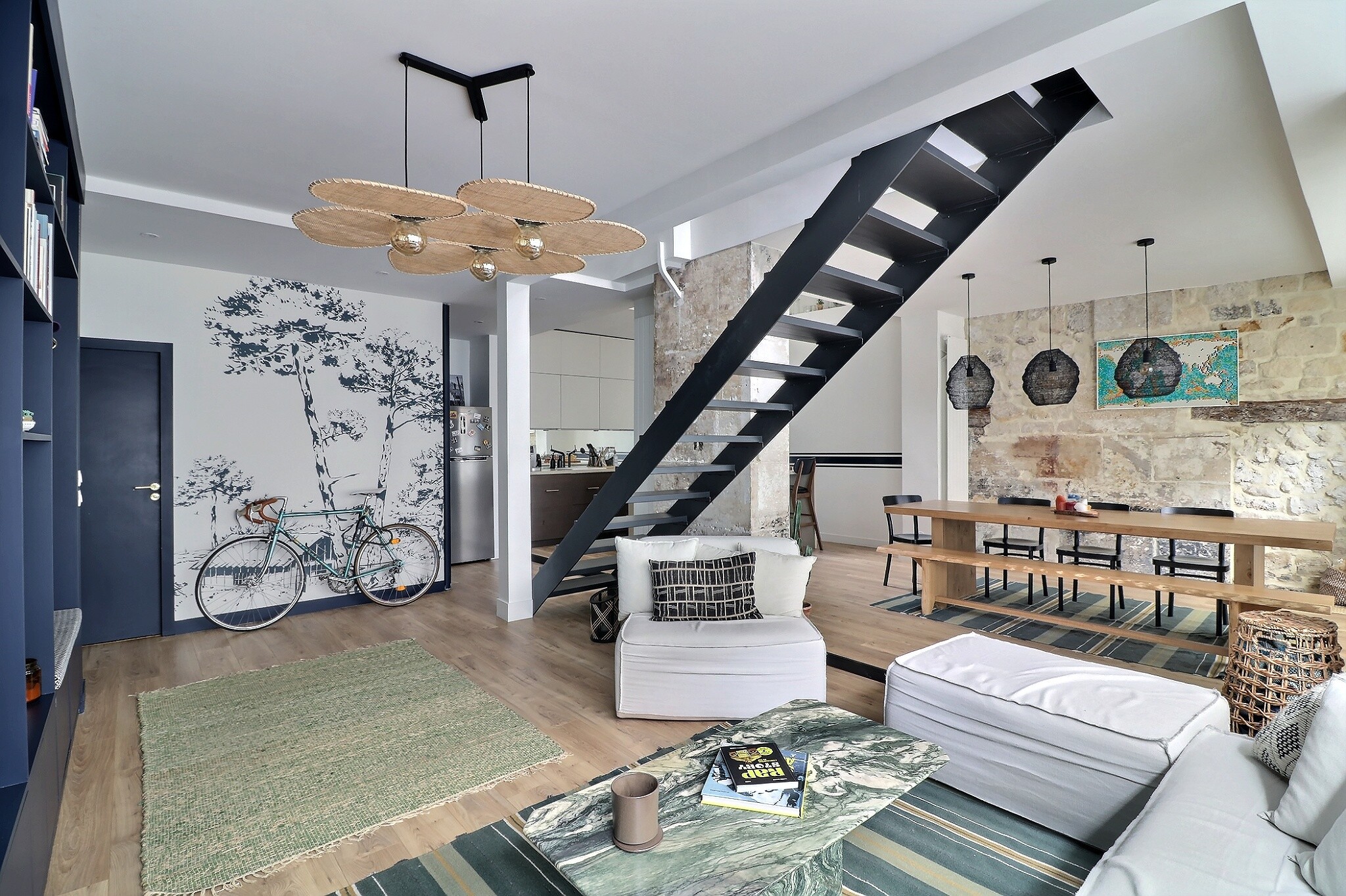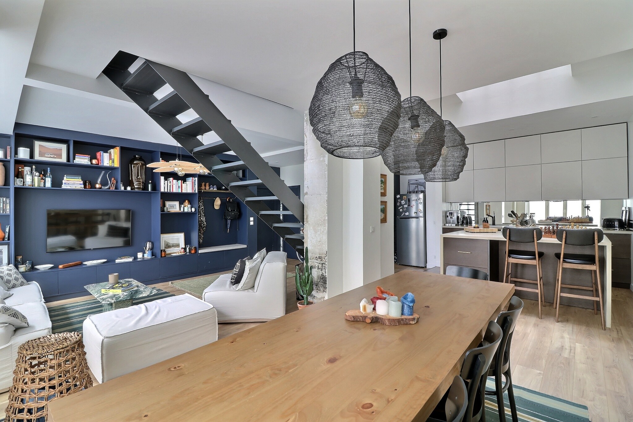 Ce duplex de 5 pièces au style loft séduit immédiatement de par ses beaux volumes avec une belle hauteur sous plafond, il se compose d'un vaste espace de réception composé d'un séjour avec une bibliothèque sur mesure, d'une cuisine ouverte aménagée et équipée haut de gamme donnant sur une salle à manger avec une verrière zénithale. Au premier étage, un espace nuit comprenant trois chambres avec placards sur-mesure dont une ayant une salle d'eau attenante, un coin dressing / bureau, une salle de bain, un toilette indépendant et un espace extérieur.