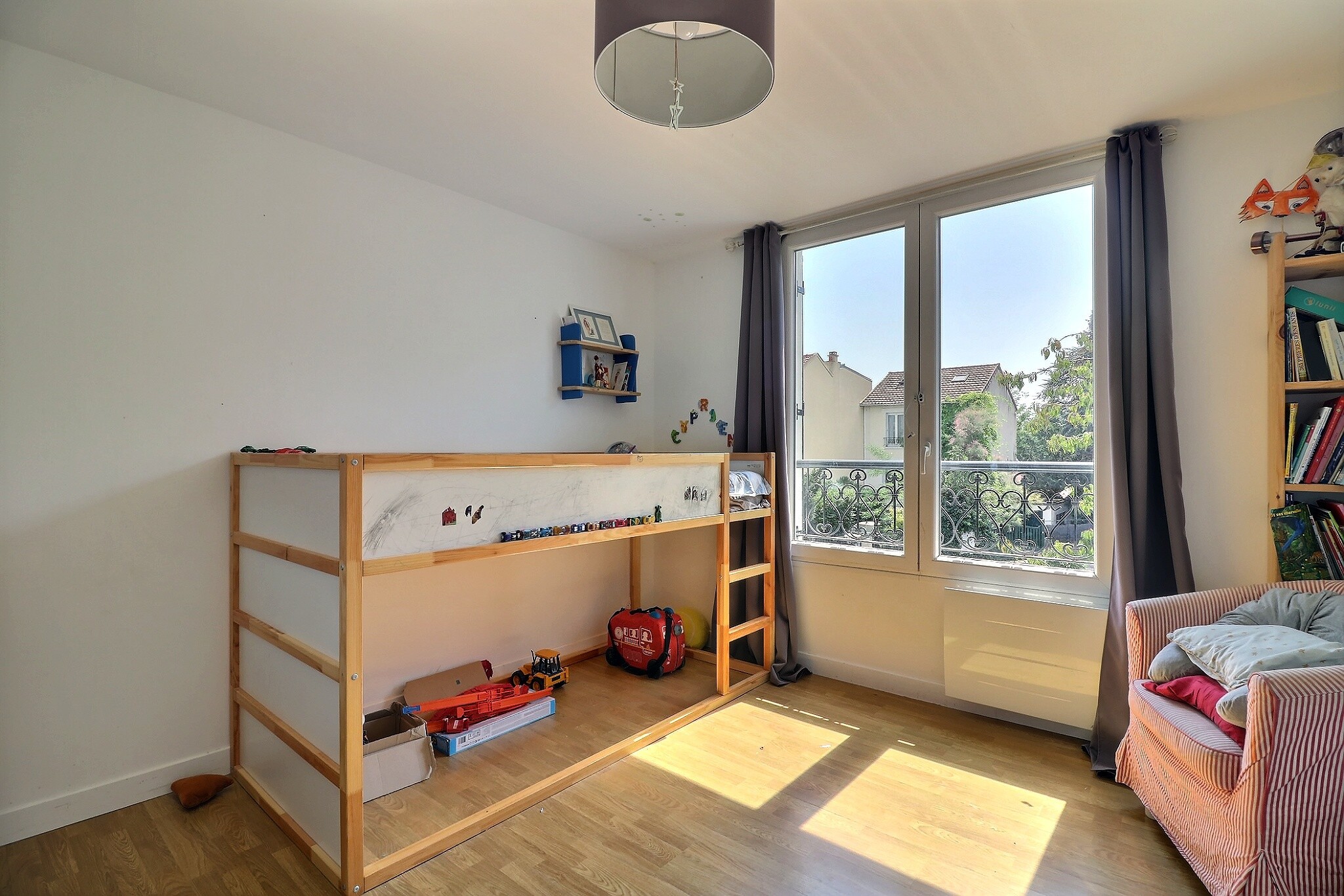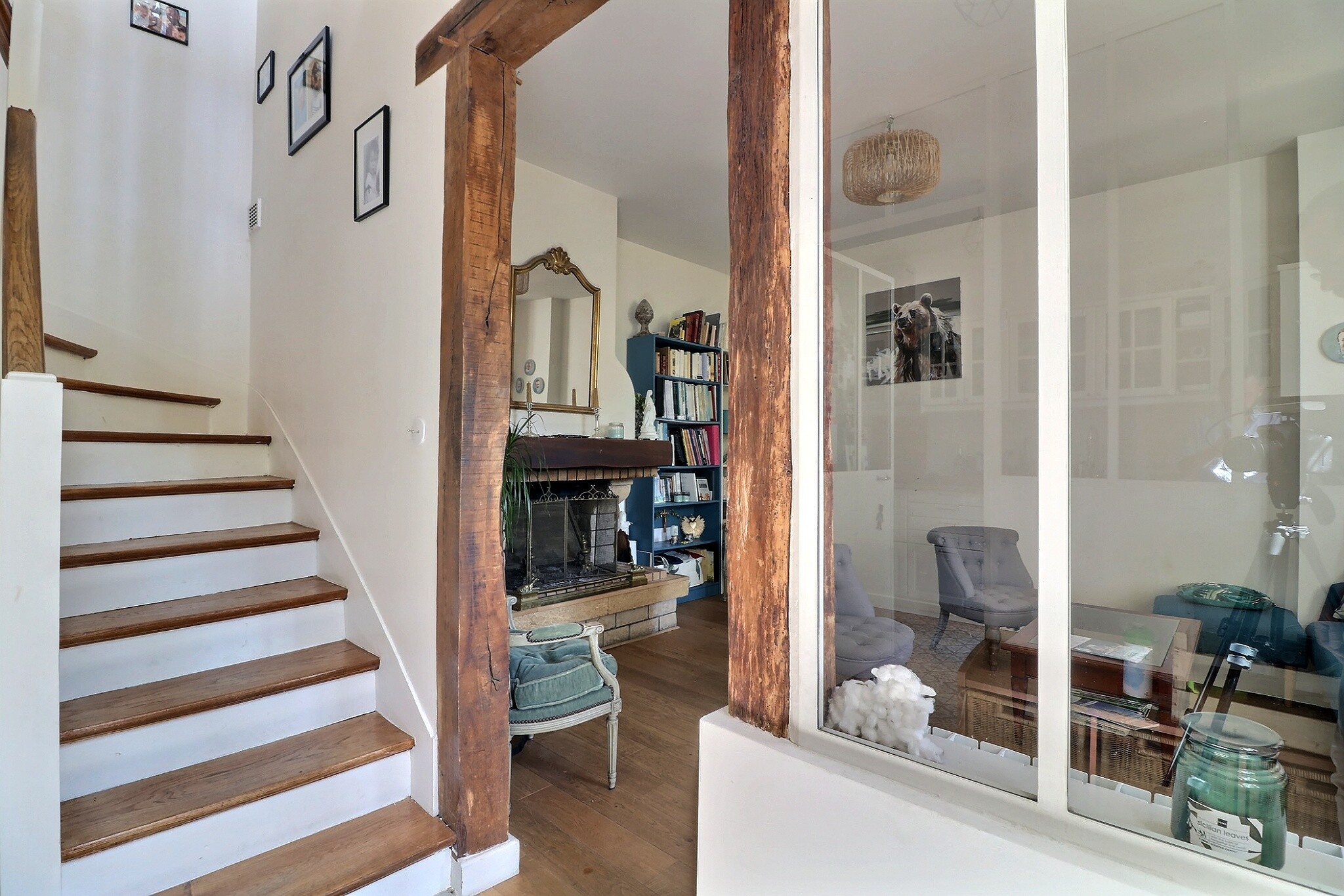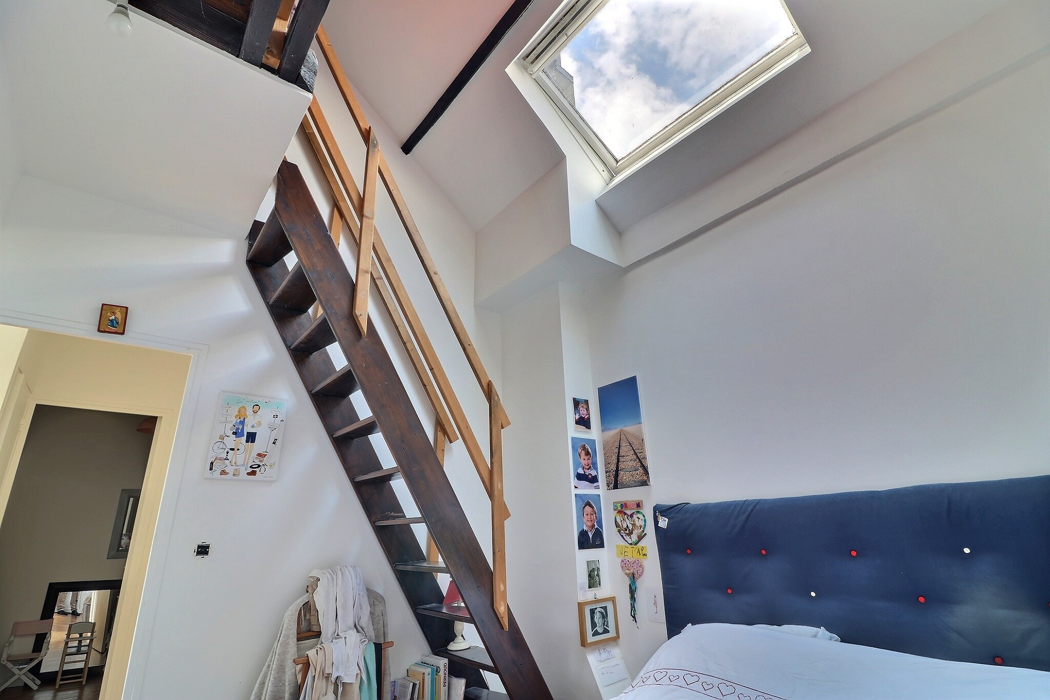 A cet étage, vous apprécierez les nombreuses fenêtres sur jardin, l’ensoleillement, le charme de la cheminée et surtout ses volumes non linéaires.