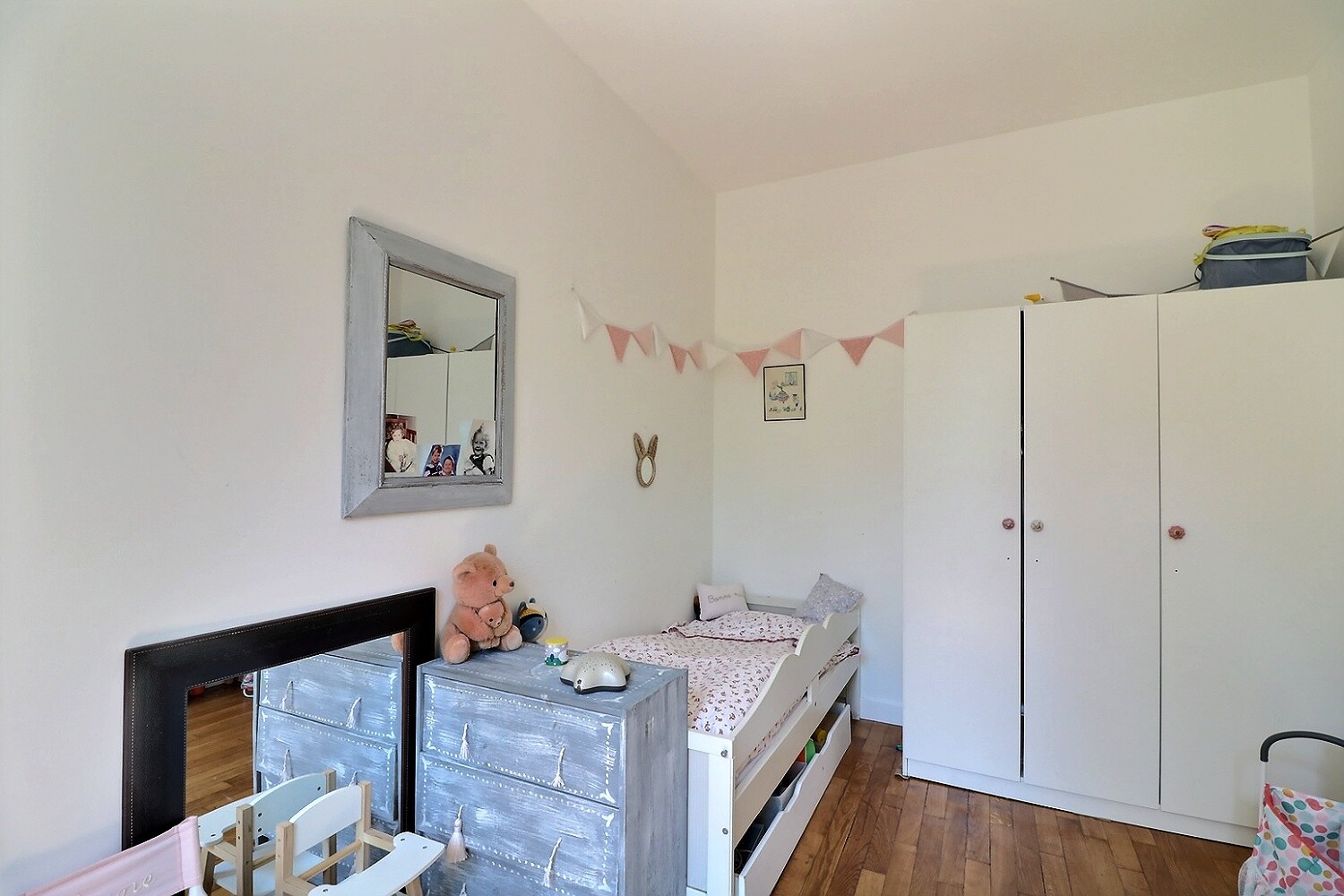Au 2nd niveau se trouvent 3chambres, wc séparés, vaste salle de bains. Cette partie est parfaitement optimisée, et donne la part belle à des chambres spacieuses dont celle des parents qui profitent d’un accès aux combles transformés en vaste espace de bureau et rangement.
